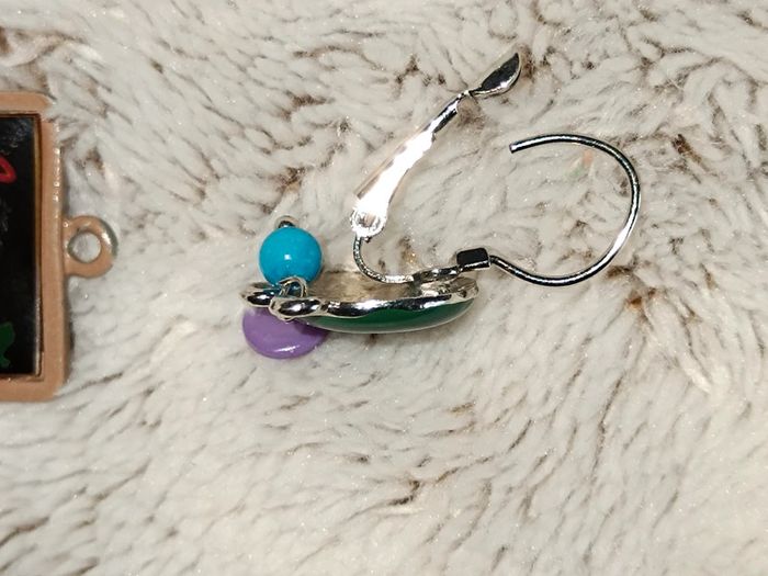 À réparer : Une boucle d'oreille fonctionne très bien, il manque juste les fils colorés L'autre boucle d'oreille: crochet qui reste ouvert et il manque un petit anneau pour fixer la partie tableau et la partie haute avec le vert/mauve/bleu.