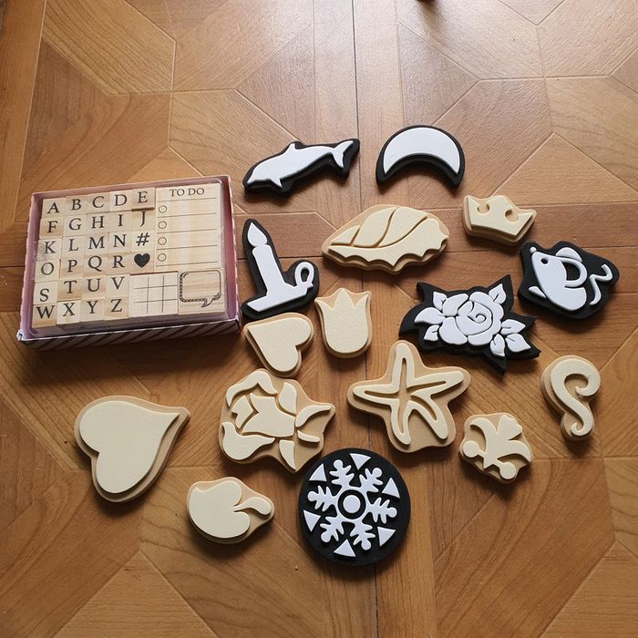 1 set de lettres en bois (31 tampons) 1 lot de 16 tampons caoutchoucs