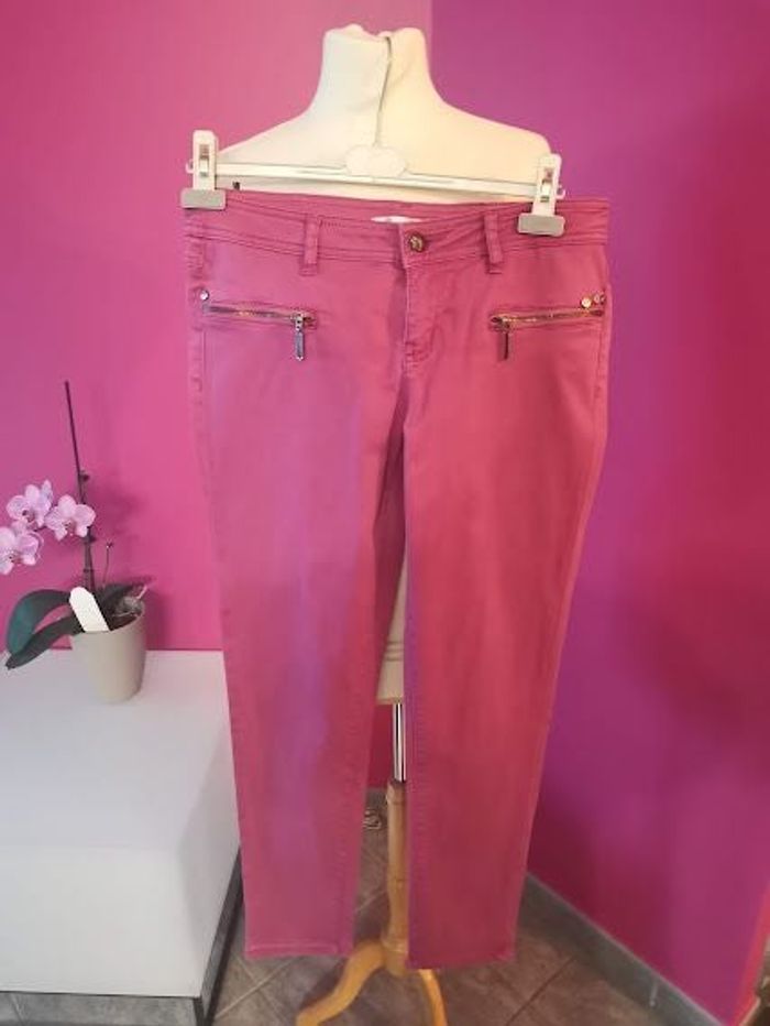 pantalon DDP en taille 30 / 40 rose fuchsia poches zippées devant coton et élastane détails rivets décors largeur taille à plat : 42 cm hauteur taille /entrejambe : 22 cm hauteur entrejambe/bas : 78 cm