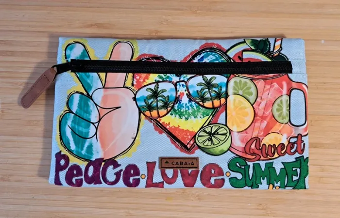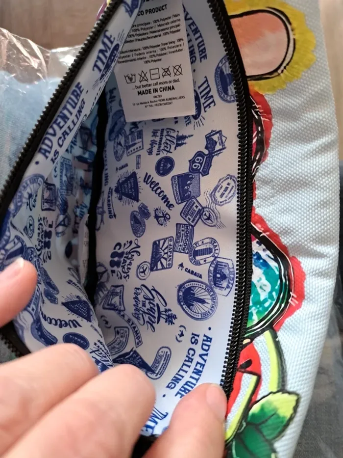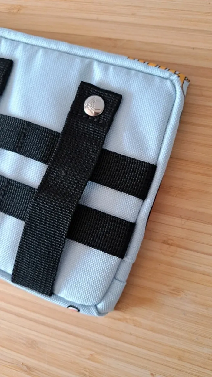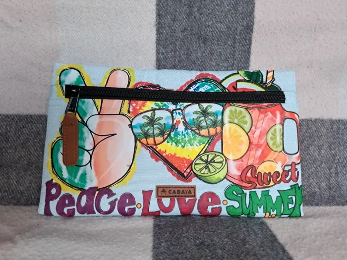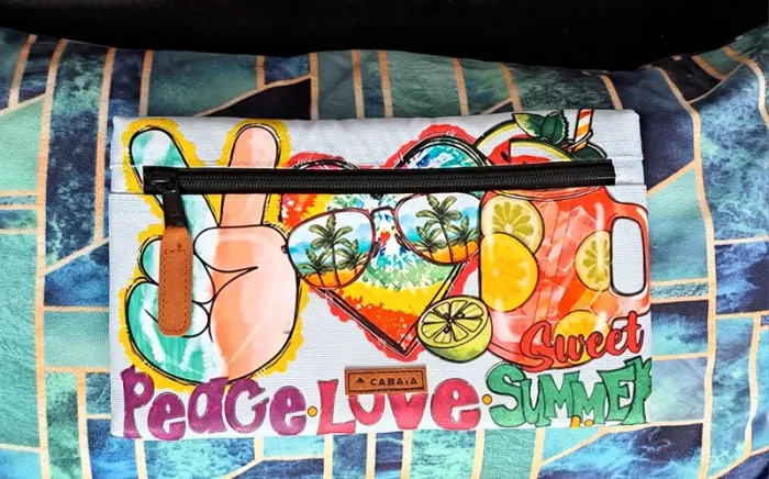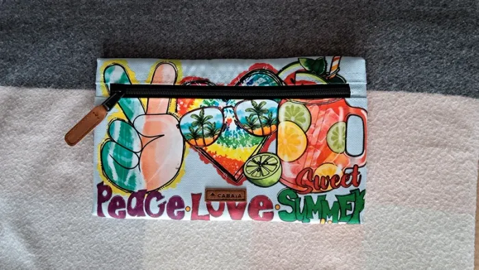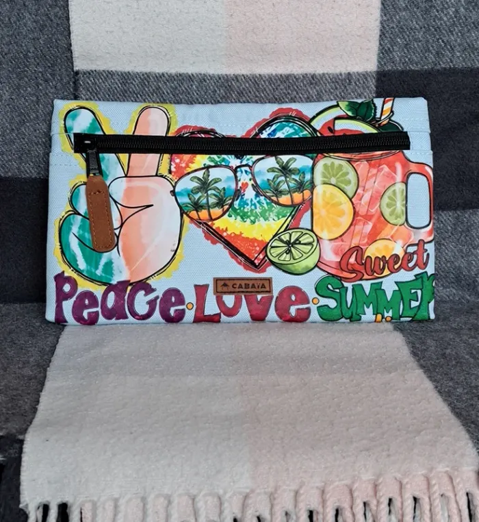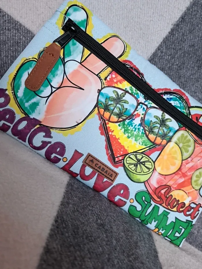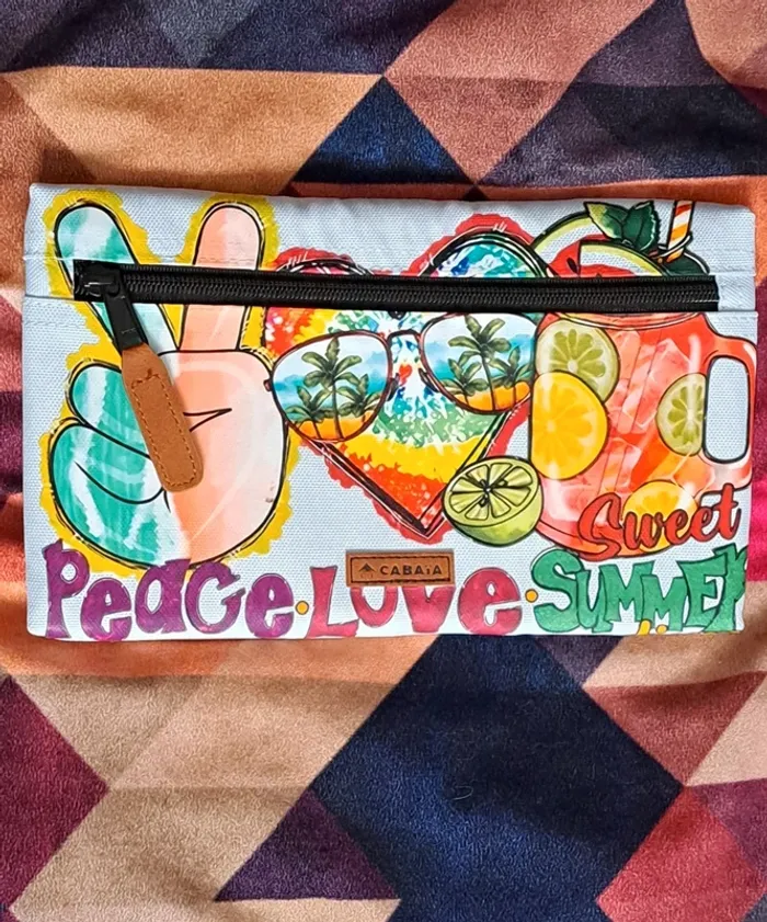 Pochette frontale L Cabaia Pour tous les sacs a dos sauf Xs, lunch bag, sac à langer, housse ordinateur.. Bleu ciel, jamais portée. Customisée: thermocollant thème estival. Peace love sweat summer Cf photos. Vous achetez ce que vous voyez.