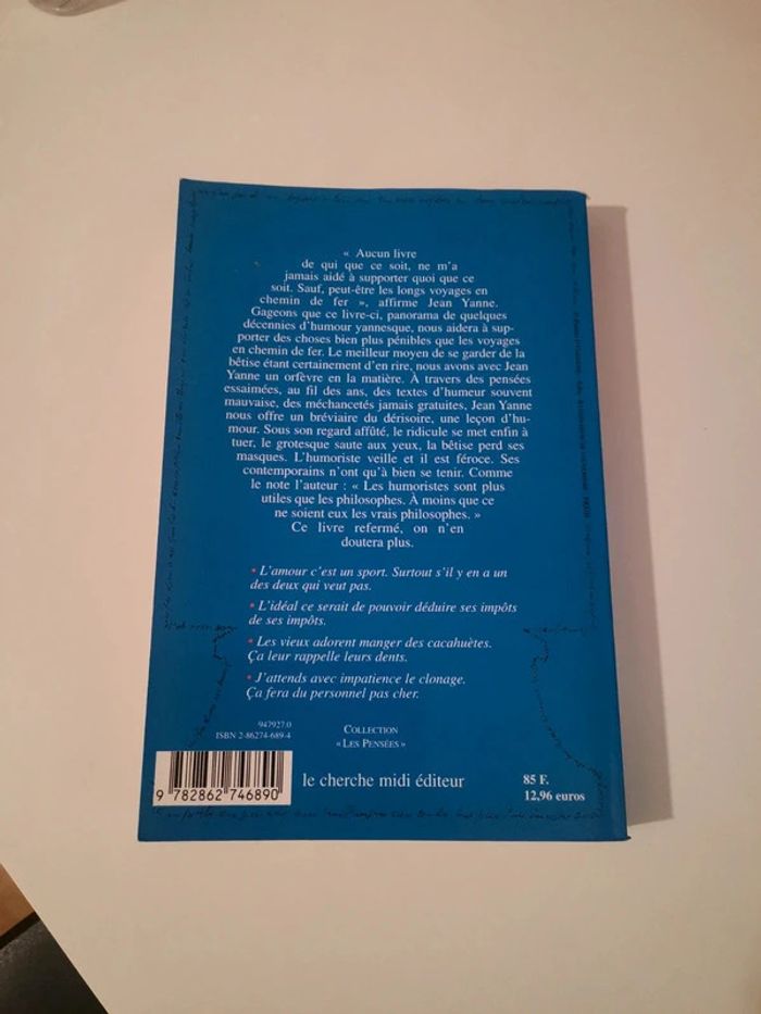 Livre sur les pensées, répliques, textes et anecdotes de Jean Yanne . Les écritures sont assez grandes. La lecture se fait facilement. À peine feuilleté. Les pages sont légèrement jaunies dû au temps uniquement. -- #dadoulivres -- #danou00_03