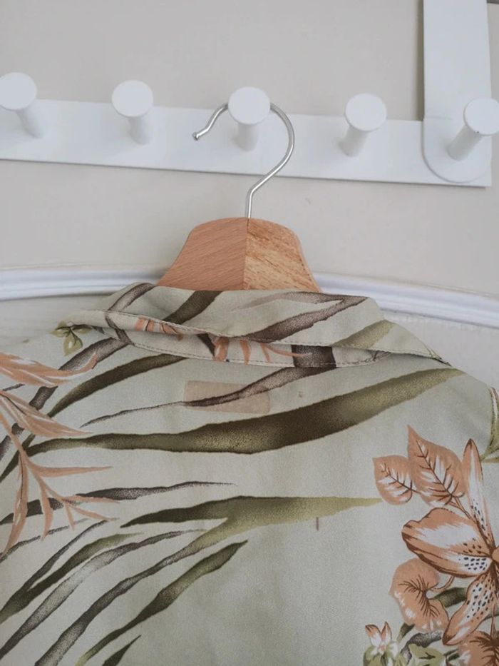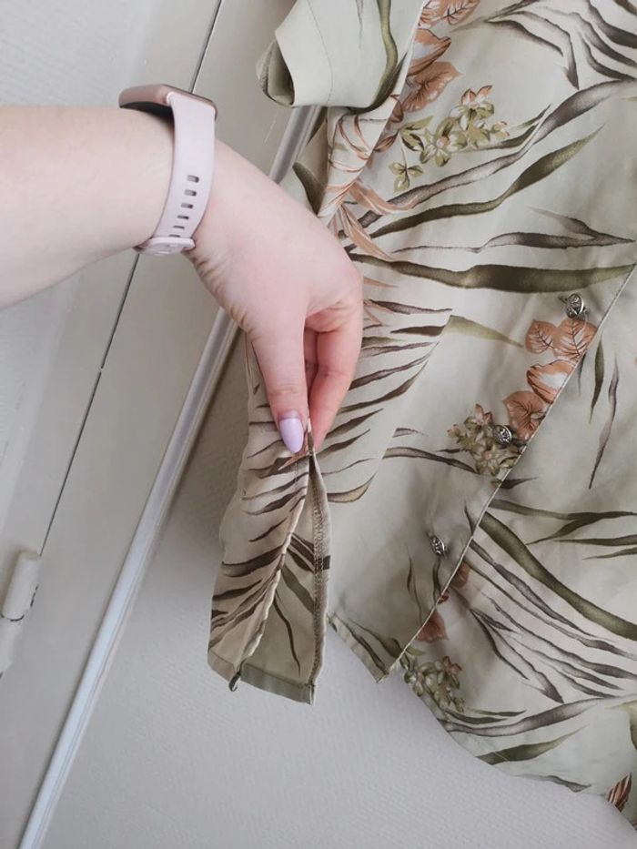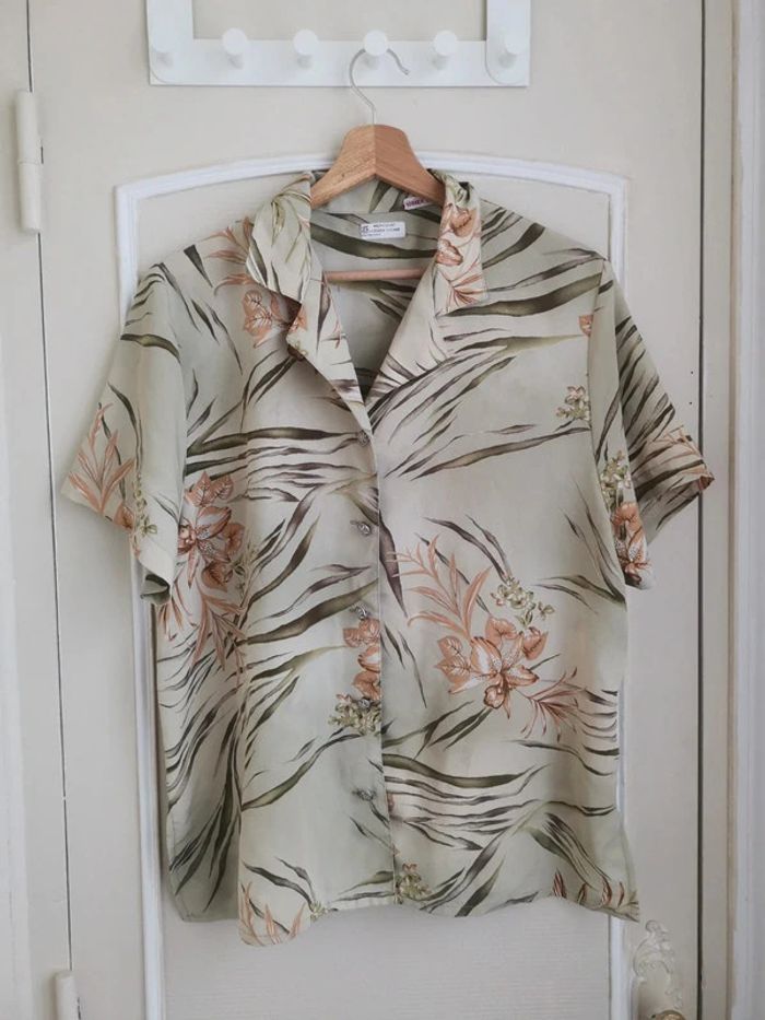 Taille 46. Jolie chemise fluide 100% polyester avec un motif floral. Très agréable à porter. Epaules 43cm, aisselles 56cm, longueur 65cm. À noter : l'étiquette d'appartenance, je n'arrive pas à la retirer + 1 petite tâche à l'arrière photo 5. Economisez les frais de port en suivant #danou_46 -- #danou00_BACB1 #danou00_03