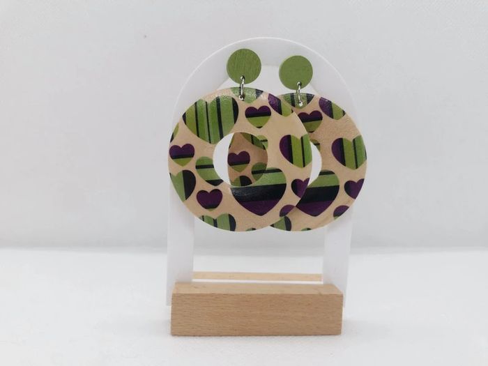 Paire de boucles d'oreilles motif Pop' avec des petits cœurs vert et violet. Matière en bois plein. Légères. Envoi prévu dans un petit emballage si c'est pour offrir. #dadoubijoux #dadouaccessoires #dadou_rubalas -- #danou00_06
