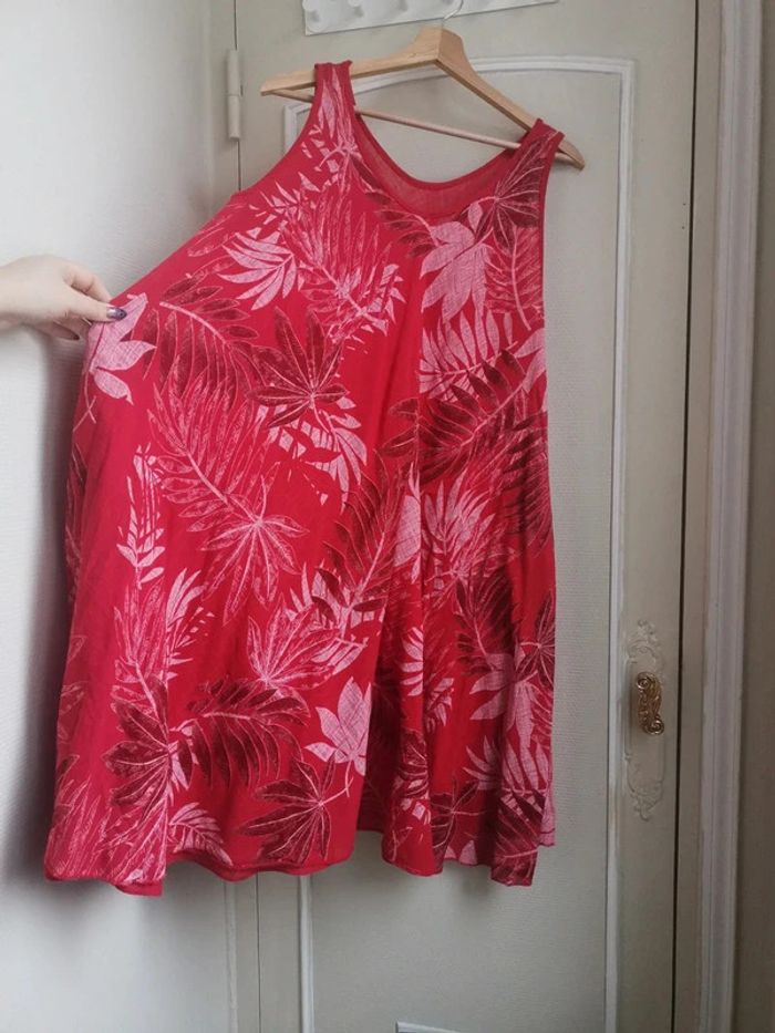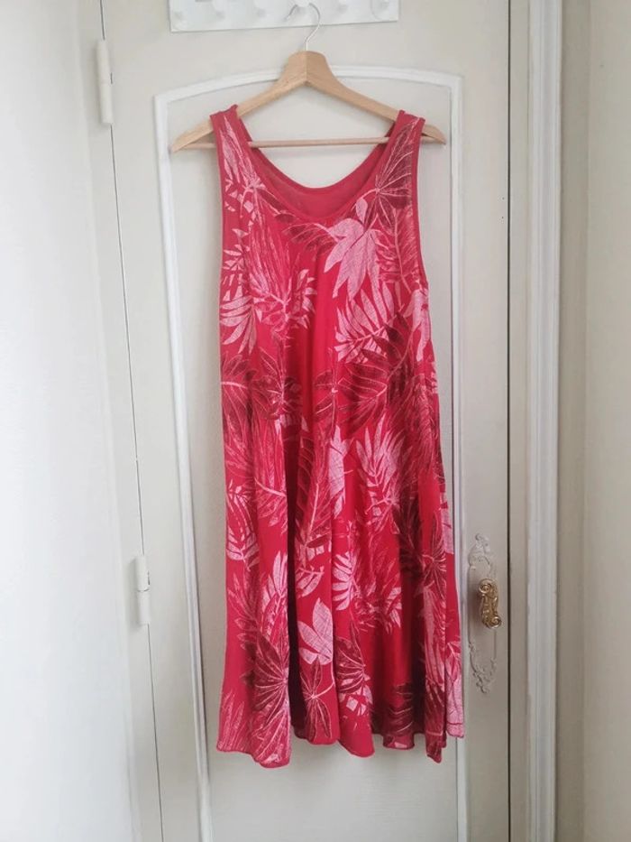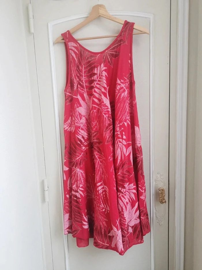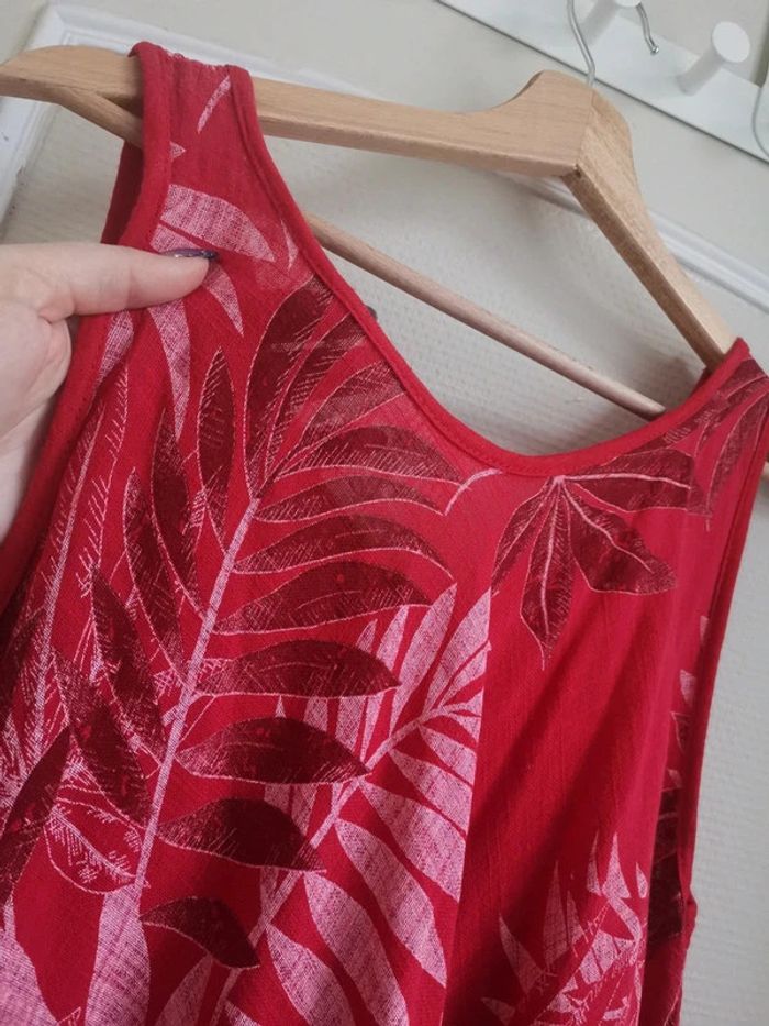 Comme neuve. Jolie robe rouge manches courtes avec un motif floral. Taille unique correspond facilement du 40 au 44. Idéal à accessoiriser avec une ceinture. Légèrement transparente. 100% coton. Mesures : bretelles 27cm, aisselles 57cm, longueur 102cm.