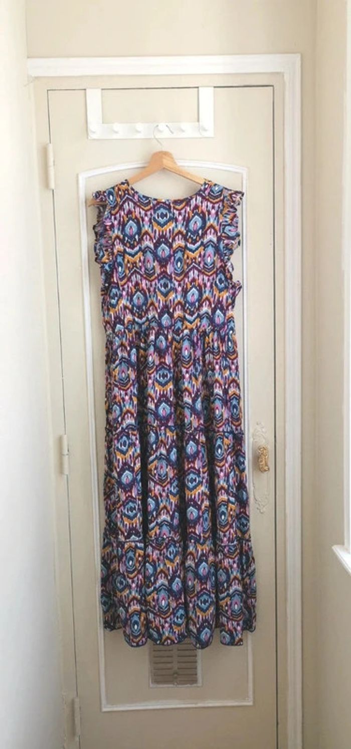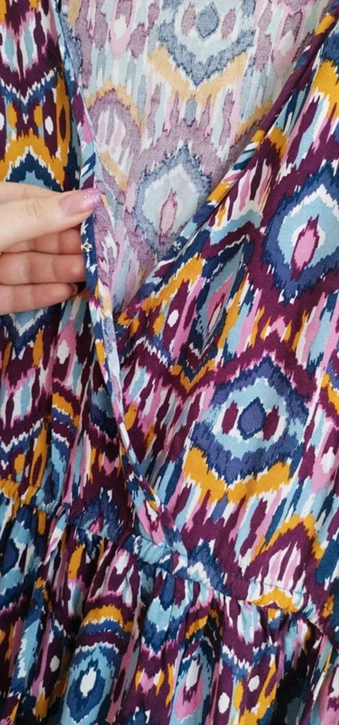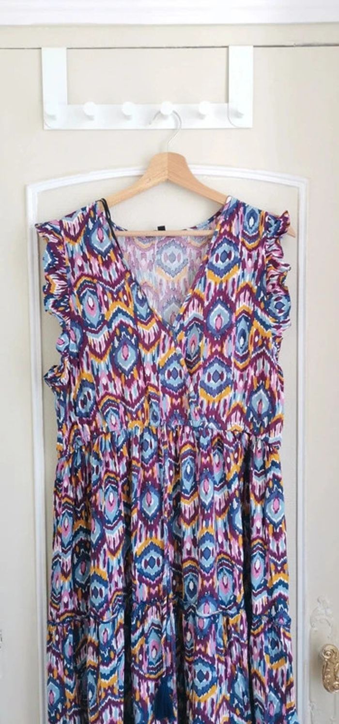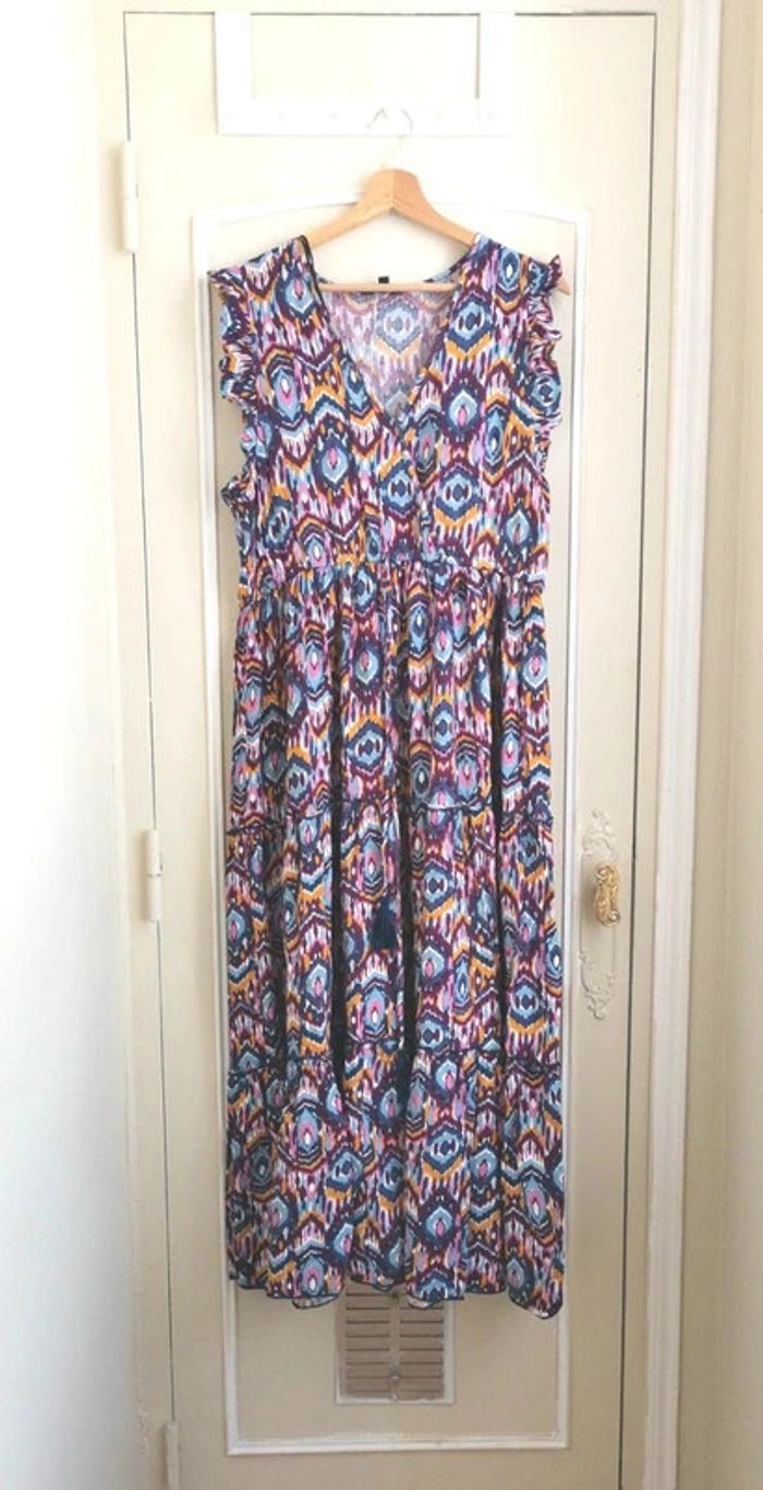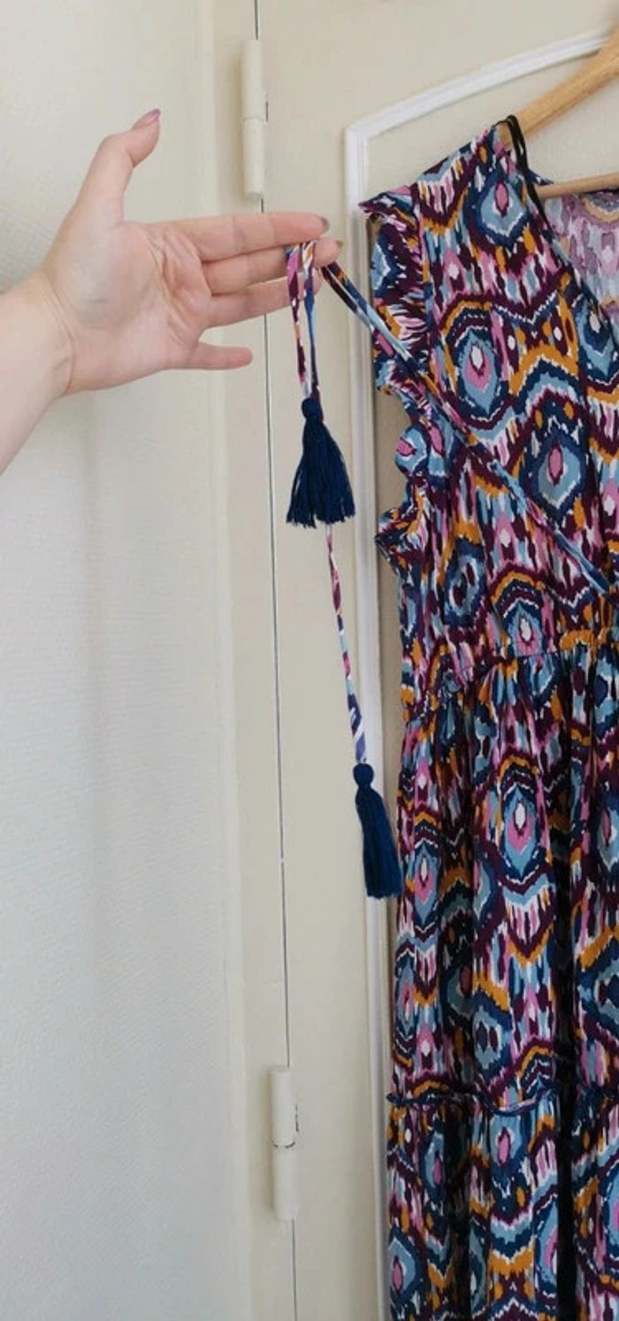 Portée une fois, comme neuve. Robe de la marque Zamba en taille 46. Très jolis motifs un peu géométriques et de toutes les couleurs. Pompons au bout du lacet qui ressert sous la poitrine / la taille. Décolleté sécurité par bouton pression. De légers froufrous au niveau des manches et tout au long de la robe. Longueur tibia-chevilles selon votre taille (se fier aux mesures ci-après) Dimensions : épaules 47cm, aisselles 51cm, longueur 128cm. 100% viscose donc très agréable à porter.