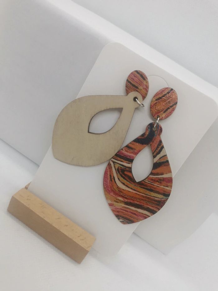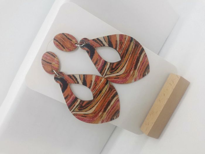 Paire de boucles d'oreille forme goutte motifs aztèques. Neuves. Matière bois et tige en acier inoxydable. Arrière brut. Hauteur 8,5cm, largeur 4cm. Motif multicolore prédominance orange. Fermoir en silicone. Idéale pour agrémenter vos jolies tenues, en toutes saisons. Allure vintage et originale. #dadouaccessoires #dadoubijoux -- #danou00_06
