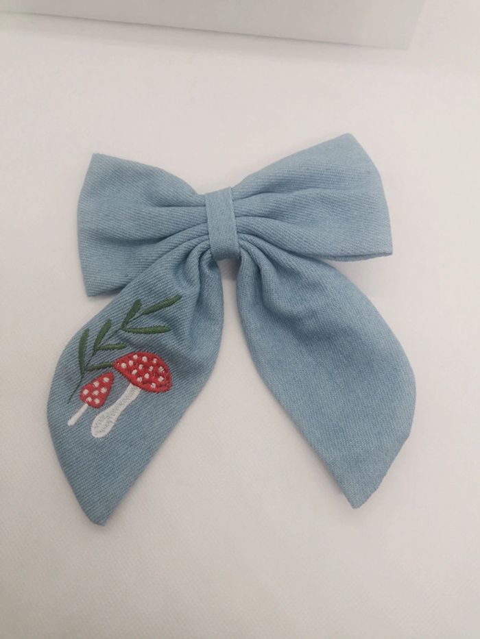 Pince nœud pour cheveux avec attache barrette - motif champignon et feuille - matière semblable au jean. 15cm de large - 16,5cm de hauteur. #dadoubeauty #dadouaccessoires -- #danou00_06