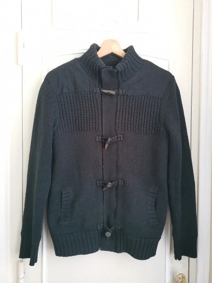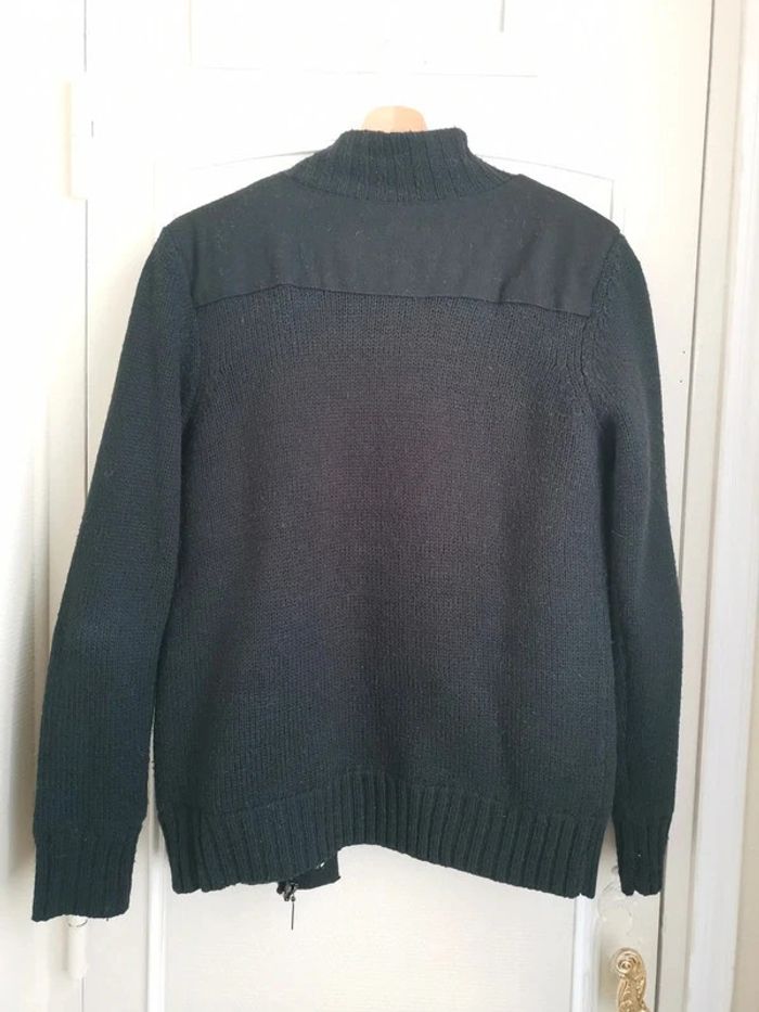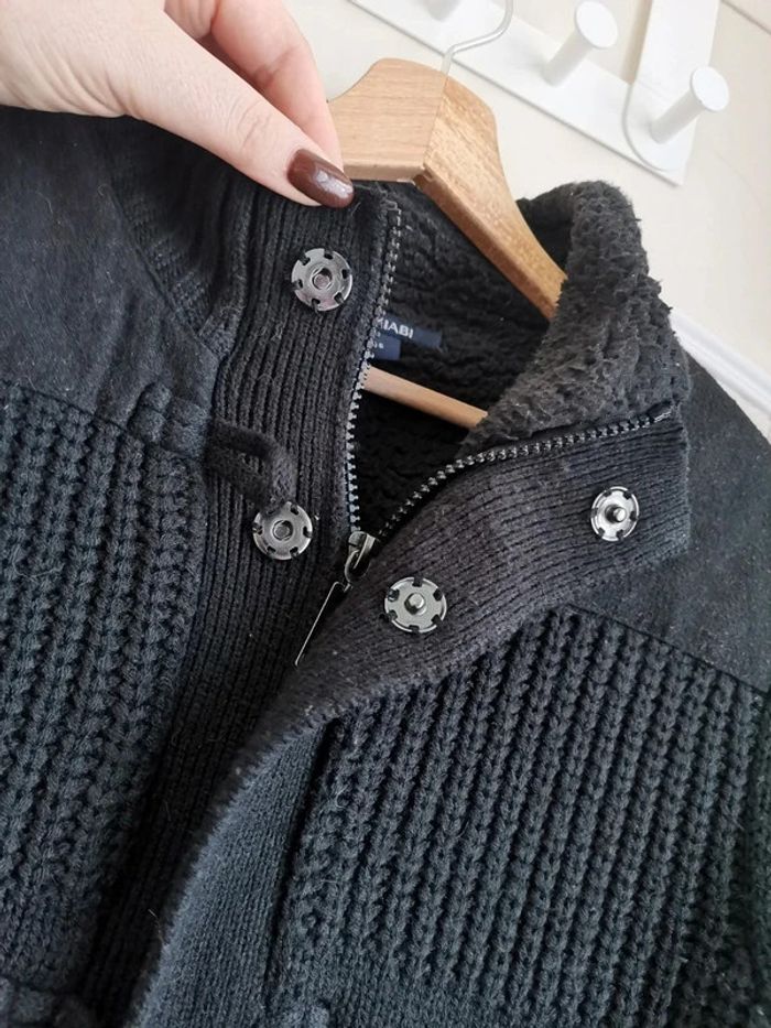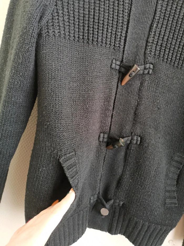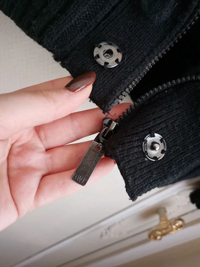 Note : La marque rouge est dû à mon téléphone, l'article est 100% de couleur noir ! Marque Kiabi - taille S. 100% acrylique. Se fier aux mesures : Épaules 45cm, Aisselles 49cm, Manches 63cm, Longueur 67cm. La matière a tendance à faire des bouloches, j'en ai enlevé beaucoup pour la vente ! Fermeture en zip + pression et liens. Tient chaud au vu de la matière mais veste idéale pour les mi-saisons. #danou_HS -- #danou00_03 #danou00_BACB
