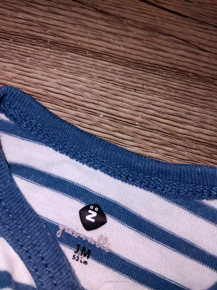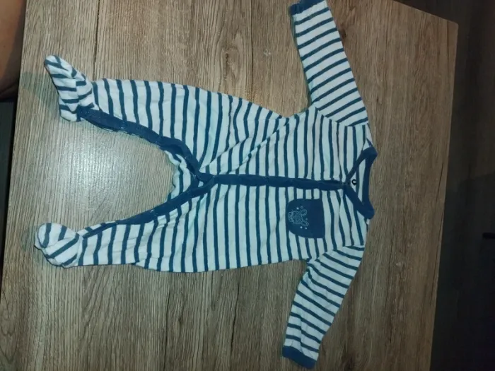 Bonjour, je vends ce pyjama rayé blanc et bleu de la marque Grain de blé taille 1mois en très bon état.