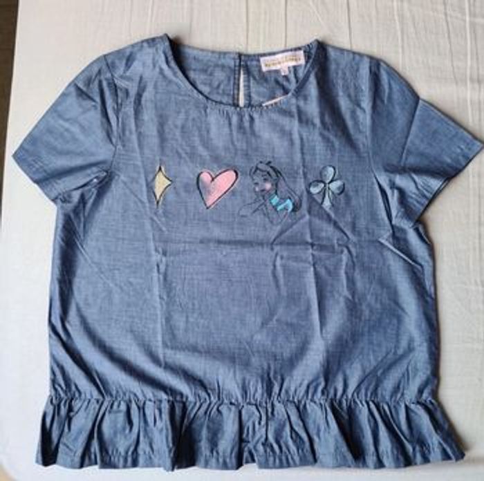 Jolie blouse courte, sur le thème d'Alice aux pays des merveilles, couleur bleu jean, officiel Disneyland Paris, neuve avec 🏷️ * Petit cabas Disneyland offert pour l'achat de 2 articles disney dans mon dressing 😊(voir dernières photos) #femmeblousealiceauxpaysdesmerveillesneuve #disneylandparisfemmeblousealiceneuve