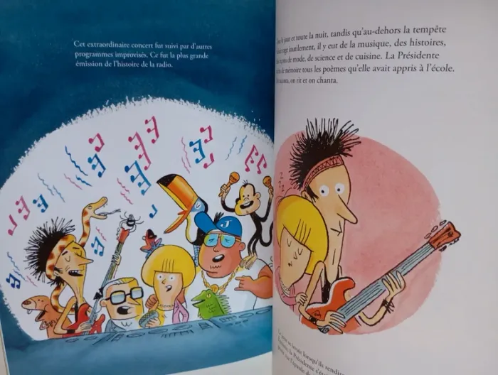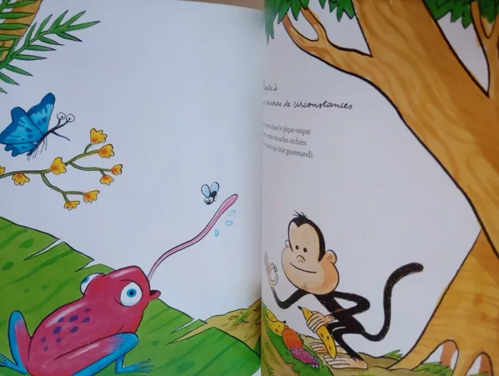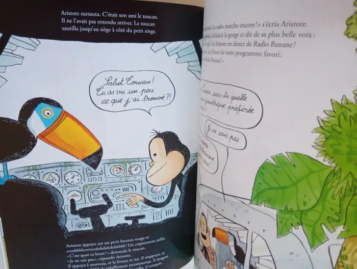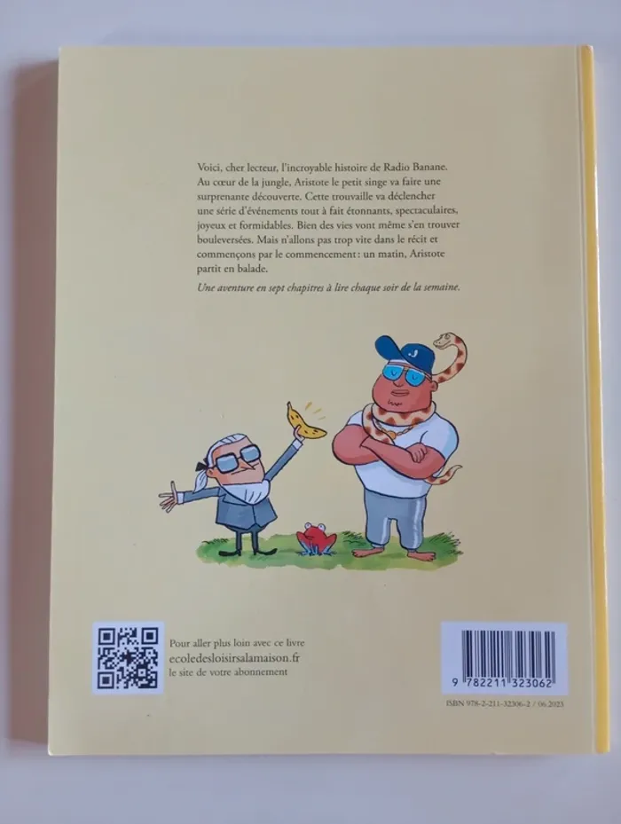 Voici, cher lecteur, l’incroyable histoire de Radio Banane. Au coeur de la jungle, Aristote le petit singe va faire une surprenante découverte. Cette trouvaille va déclencher une série d’événements tout à fait étonnants, spectaculaires, joyeux et formidables. Bien des vies vont même s’en trouver bouleversées. Mais n’allons pas trop vite dans le récit et commençons par le commencement : un matin, Aristote partit en balade. Editeur : Ecole des Loisirs 75 pages Dimensions : 21 x 27 cm Âge : 6 - 8 ans Livre en excellent état Je vends d'autres livres de l'école des loisirs #phil_peg_écoledesloisirs #écoledesloisirs #jungle #forêt #jeu #singe #humour #aventure #communication