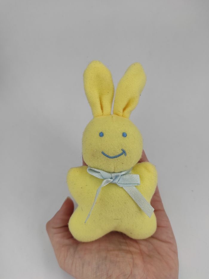 🐰 Mini Peluche Lapin Jaune avec nœud en ruban bleu autours du cou, yeux et bouche brodés en fils bleu, vintage 📏 Dimension : 12 cm environ ✨ Occasion, très bon état mais est un peu taché sur le devant 👀 Vous achetez la peluche que vous voyez sur les photos 🚭 NON FUMEUR et sans odeurs d'animaux 📬 Envoi rapide sous maximum 3 jours