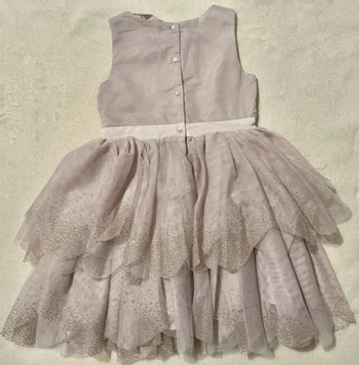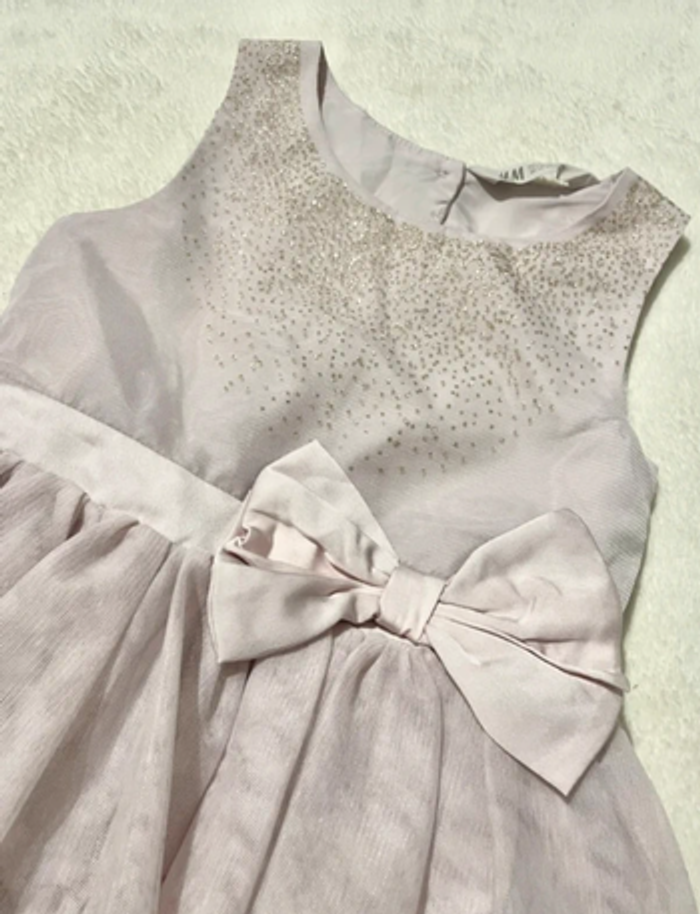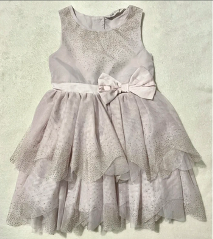 Robe en tulle fille – H&M • Marque : H&M • Taille : 4/5 ans • Couleur : Vieux rose et doré • État : Très bon état Description : Superbe robe sans manches en tulle vieux rose, ornée de paillettes dorées qui lui donnent un éclat délicat. Elle est agrémentée d’un joli nœud décoratif à l’avant et d’une coupe évasée qui apporte légèreté et élégance. L’encolure est ronde, la fermeture se fait par de petits boutons dans le dos. La robe est doublée pour un confort optimal et un tombé parfait. Une pièce idéale pour les occasions spéciales, fêtes, anniversaires ou tout simplement pour se sentir comme une princesse ✨