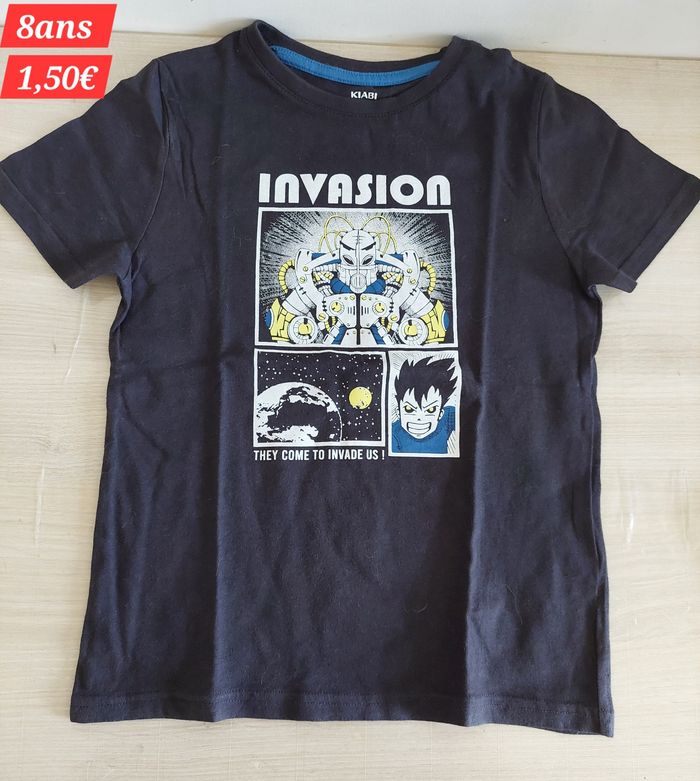 Vends T-shirt écrit invasion garçon 8ans Il est en très bon état car très peu mis Maison non fumeur Le prix d'achat est indiqué sur la photo 1
