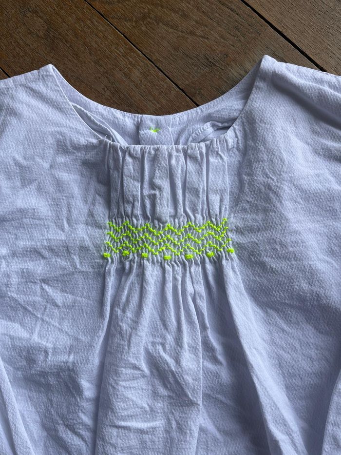 Blouse manches longues blanche avec petits smocks devant. Portée, entre bon et très bon état. Pas de trou ni de tache