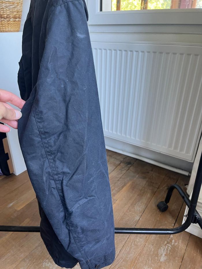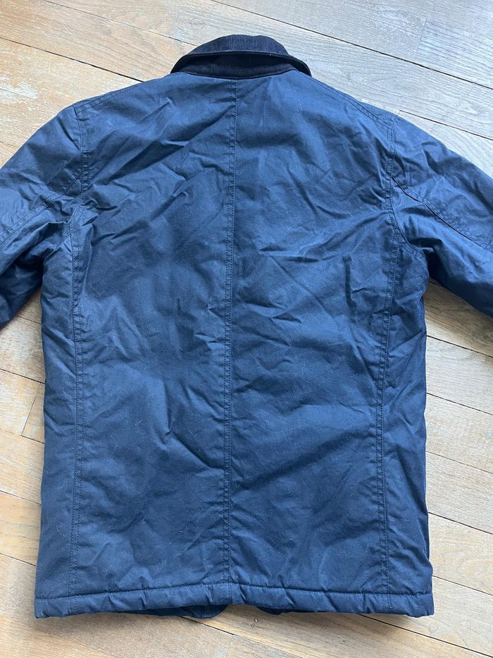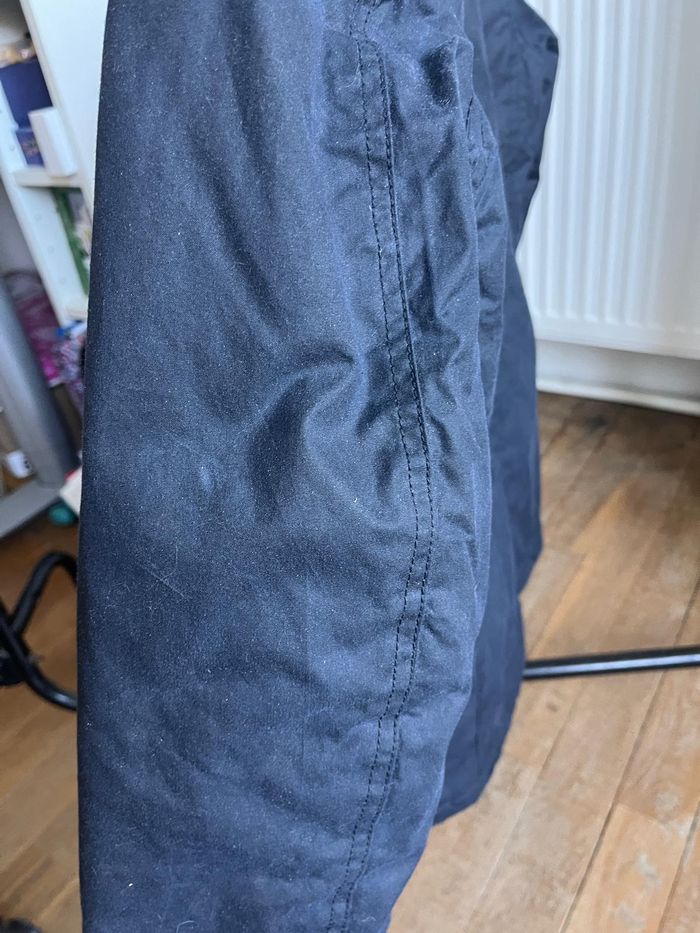 Veste marine très foncé (comme sur la photo montrant le col de près), doublée sherpa. Portée quelques fois, présente de très très légères marques de port, liées à la matière. Super état général.