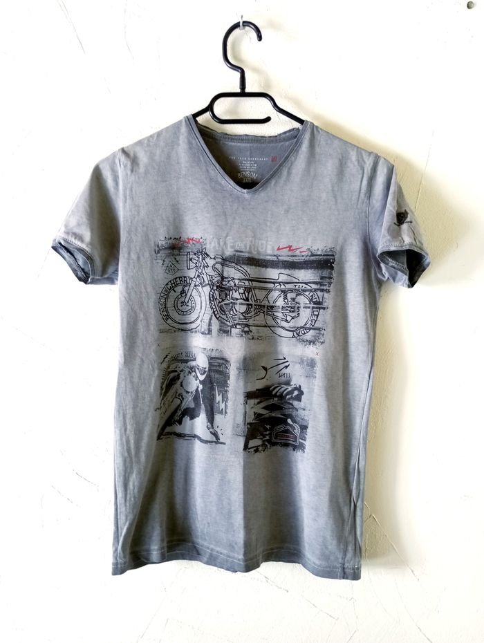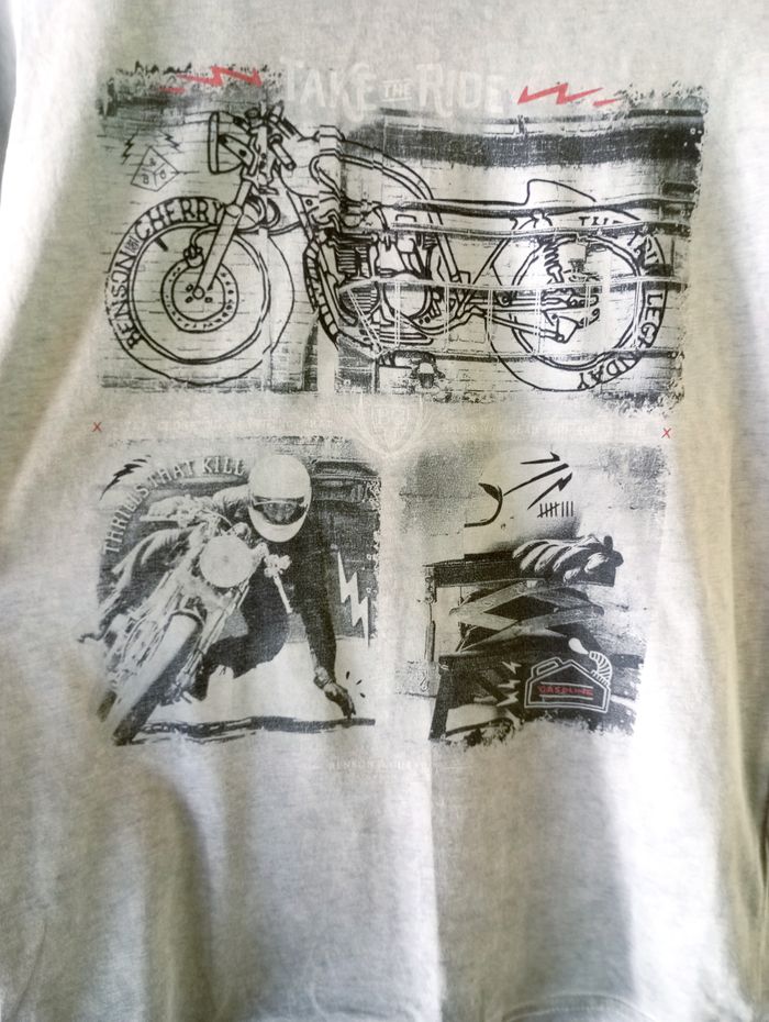 T-shirt gris effet vieilli, motif motos. Très bon état. Largeur à plat au niveau du torse : 41cm, longueur depuis le dessus de l'épaule : 60cm #frip_garçon12ans