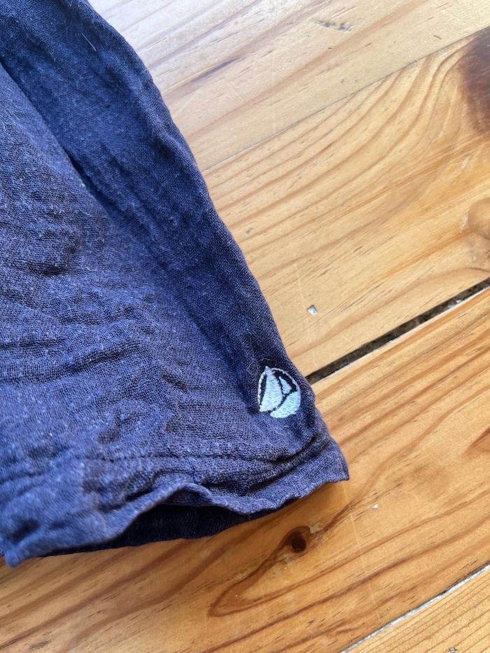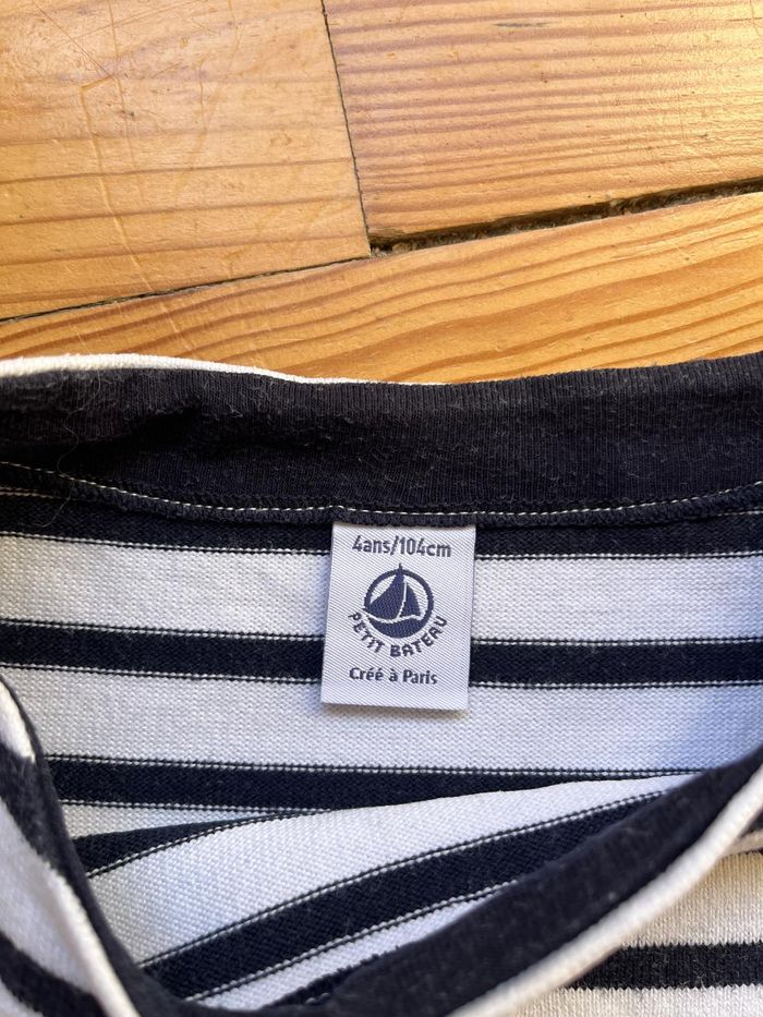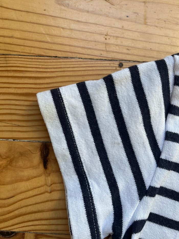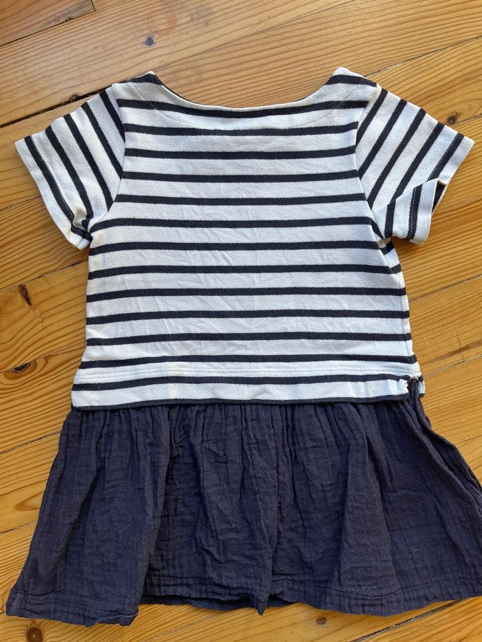 Robe à manches courtes, haut en coton épais rayé marine et blanc et bas en gaze de coton Bon état (légères taches sur la manche)