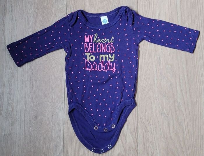 Body bleu "Tex baby" 3M "My heart Belongs to my daddy" et petit cœur rose.