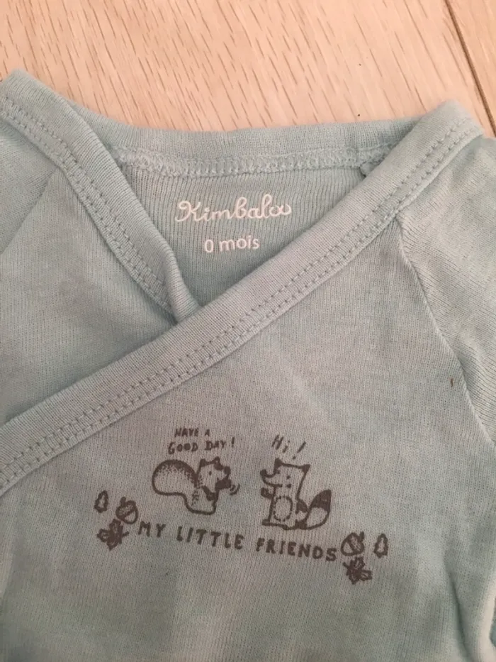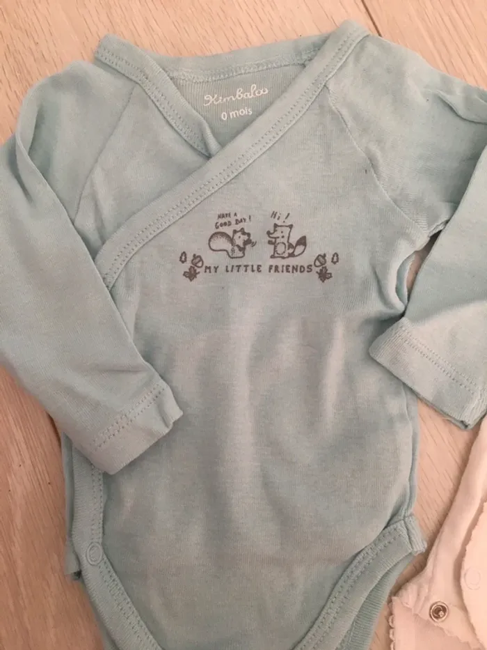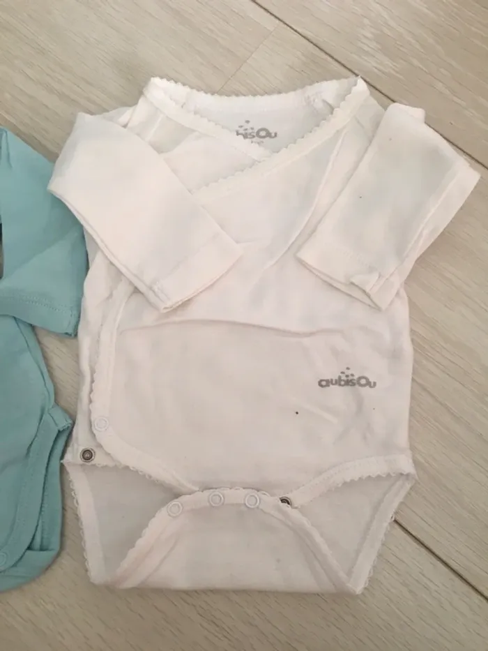 2 bodys manches longues Cache coeur 1 bleu kimbaloo noté 0 mois mais plutôt 1 mois 1 blanc au bisou 1 mois TBE Je vends d’autres articles bébé et puériculture dans mon dressing, n’hésitez pas à faire un lot 👌🌺☺️