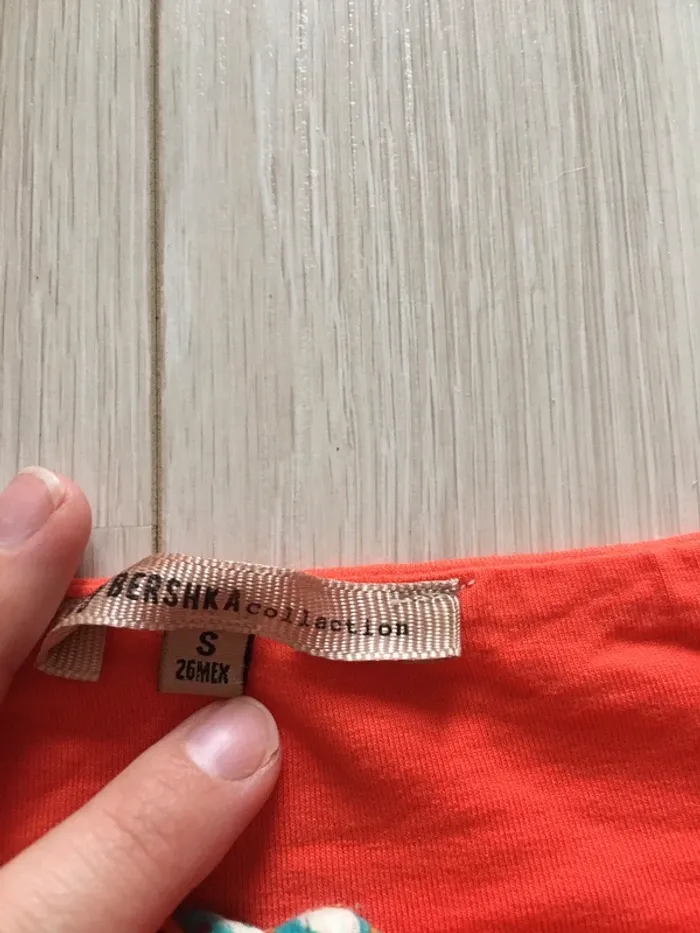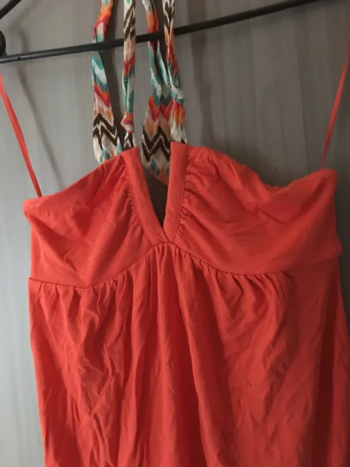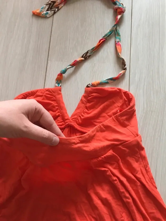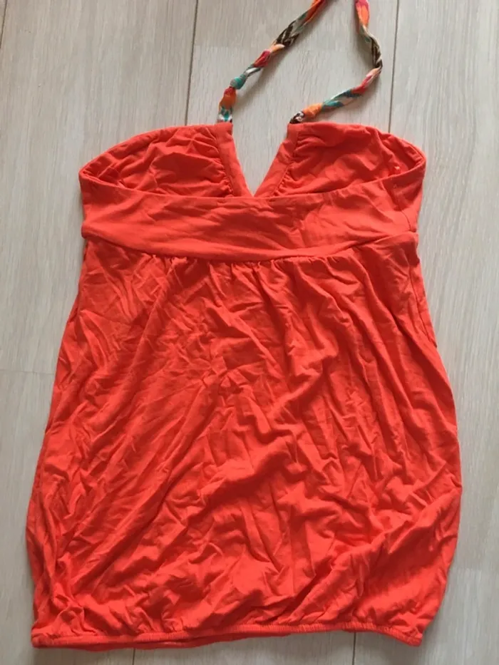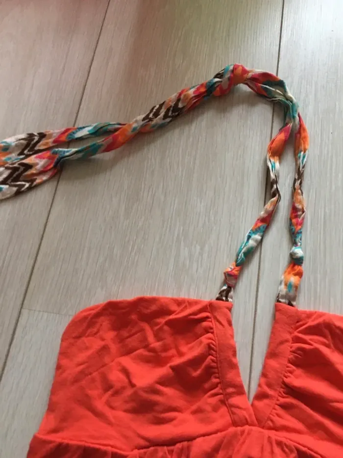 Parfait état Un bon coup de repassage et il sera comme neuf 🤩 Bershka Taille S Couleur orangée, très vive et lumineuse, idéal pour l’été 🤩 Dos nu, lanière dans le coup, légèrement resserré à la taille avec un élastique Faites des lots 👍