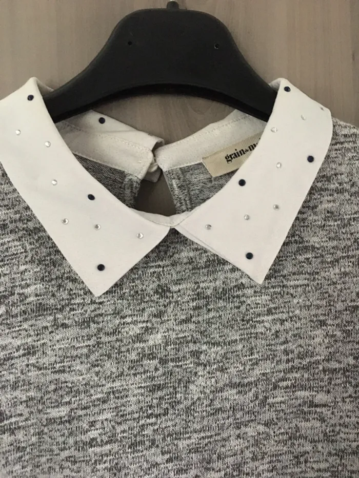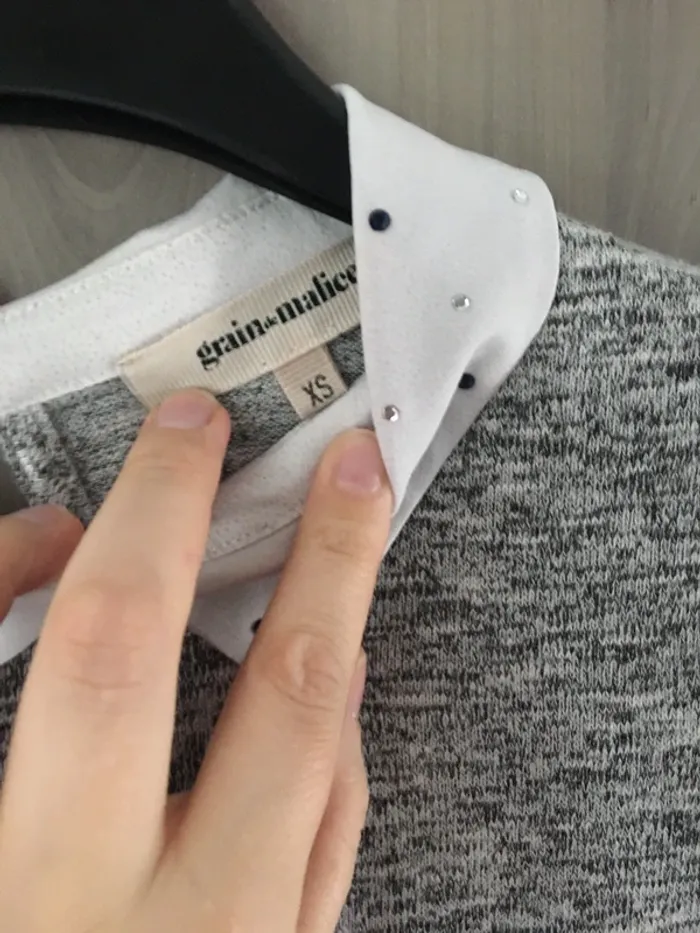 Grain de malice Taille S Il est noté XS mais les tailles ne sont pas fiables, je faisais du S quand je l’ai porté Gris avec col blanc Details en photo Manches 3/4 Super à porter, très doux Se porte près du corps Idéal printemps 🌺 Je vends d’autres tops dans mon dressing, réduction sur les lots 👍 Envoi rapide et soigné 🌺👌