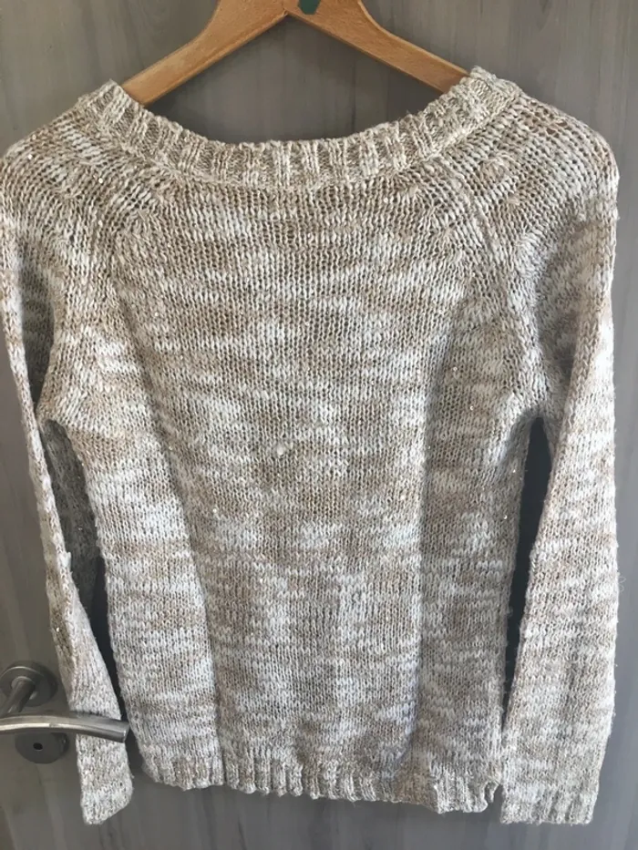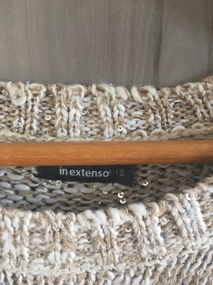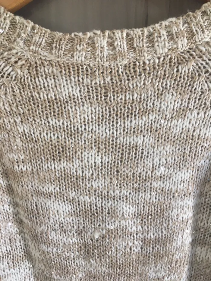 In extenso Taille S Très bon état Couleur crème et beige avec dorure et sequins Je vends d’autres pulls dans mon dressing, réduction sur les lots 👌🌺