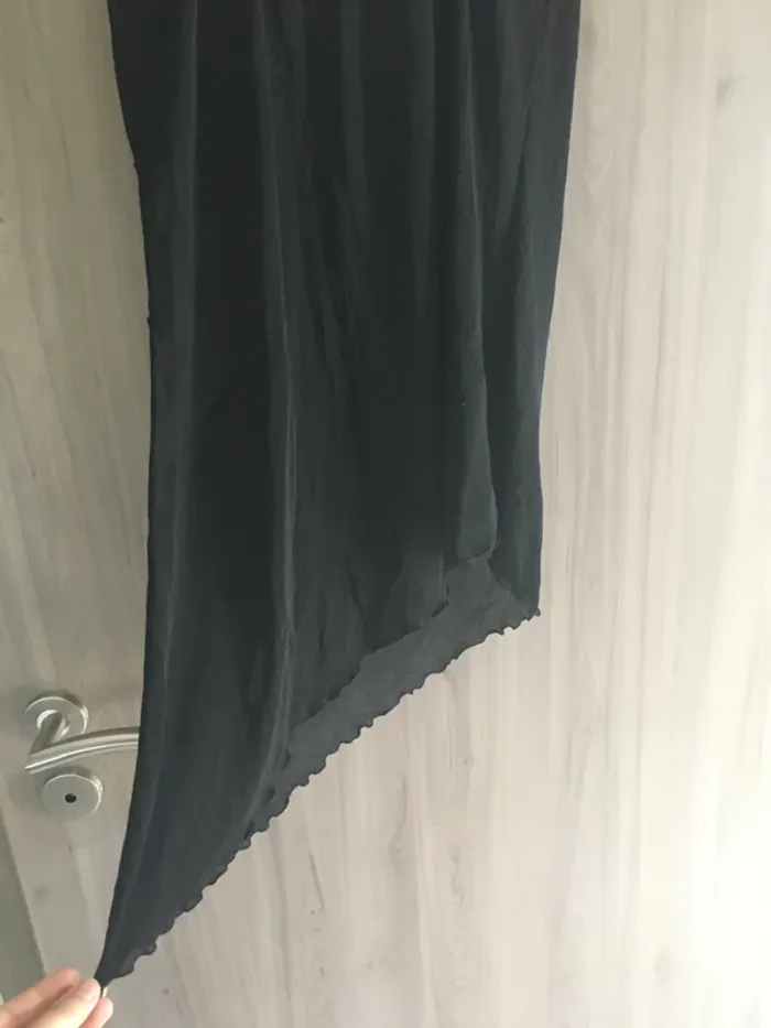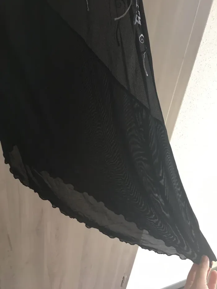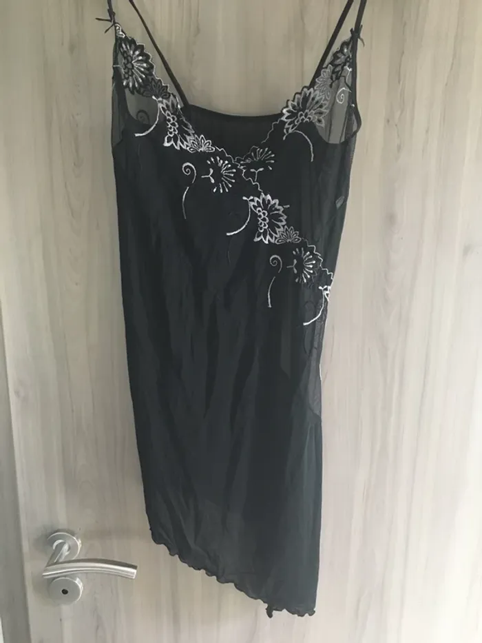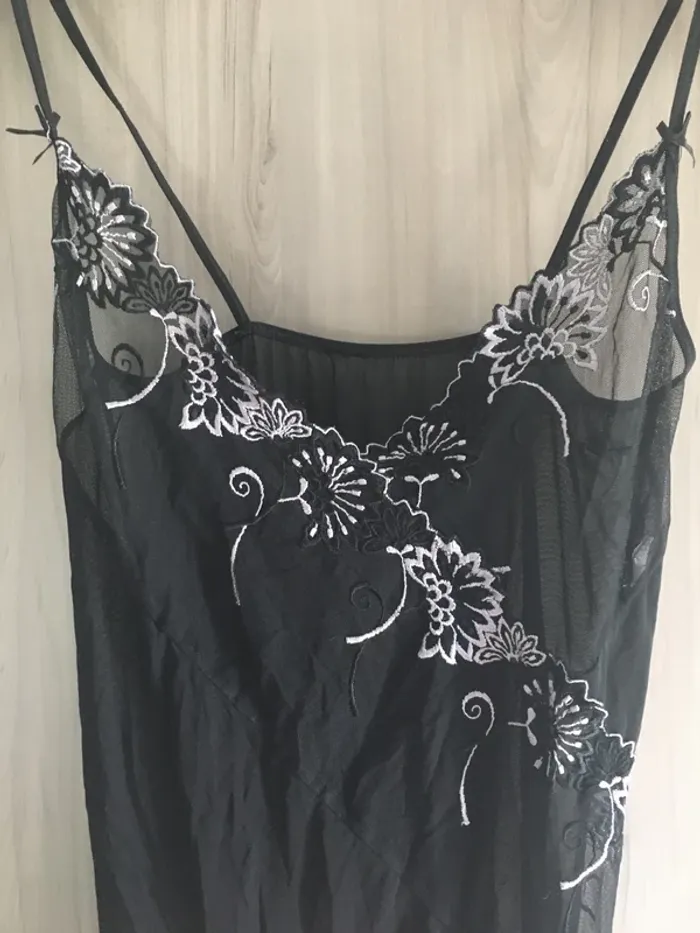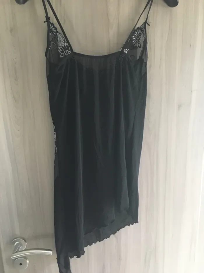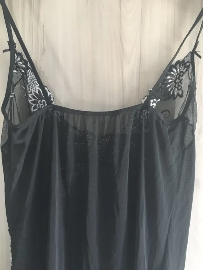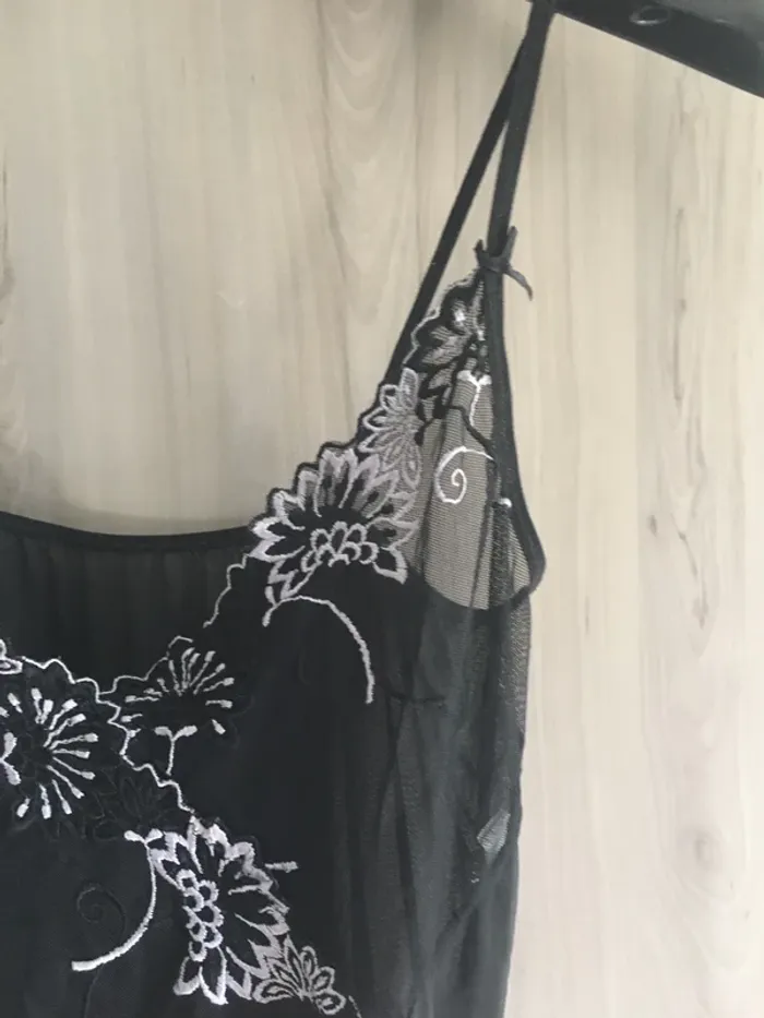 Absolument aucun défaut Nuisette entièrement en voile noir, motif fleurs noires et grises sur le décolleté Nuisette asymétrique vers le bas
