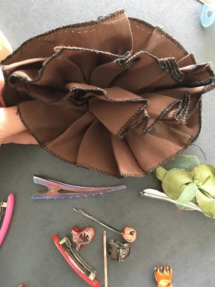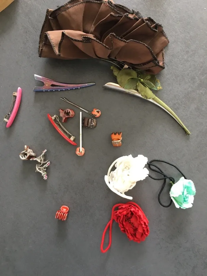 lot d’articles pour cheveux, contient des élastiques et différents types de barrettes. peuvent être vendus séparément ou avec d’autres articles.