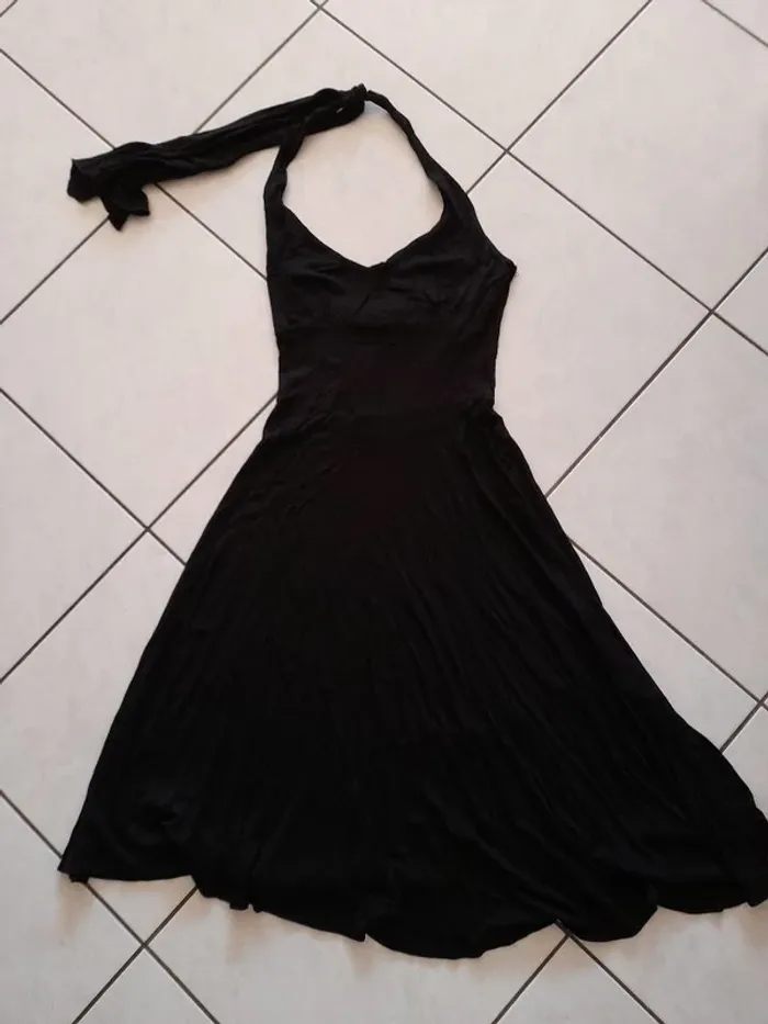 robe dos nu, se noue derrière le coup. robe évasée très fluide, très légère et agréable à porter. longueur au dessus des genoux, je fais 1m74 matière extensible taille 36 mais convient à un 38