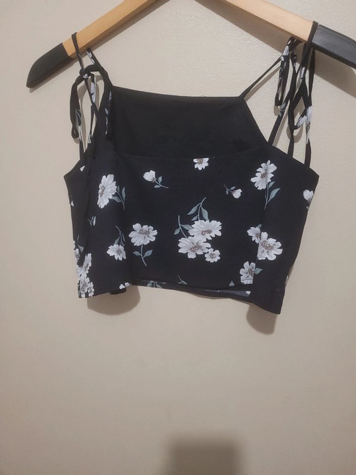 Croc top Noir à fleurs Pas de taille indiqué mais correspond à une taille 34 Dimensions aisselle à aisselle : 40 cm Longueur : 37 cm Très bon état
