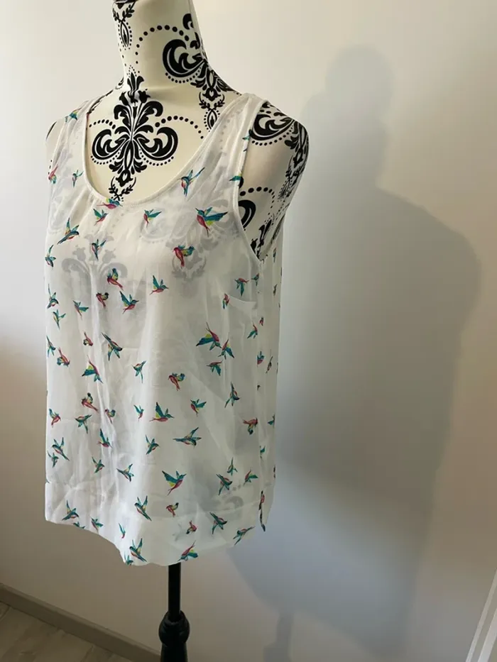 Top blouse débardeur Primark taille 38 blanc motif oiseau multicolore