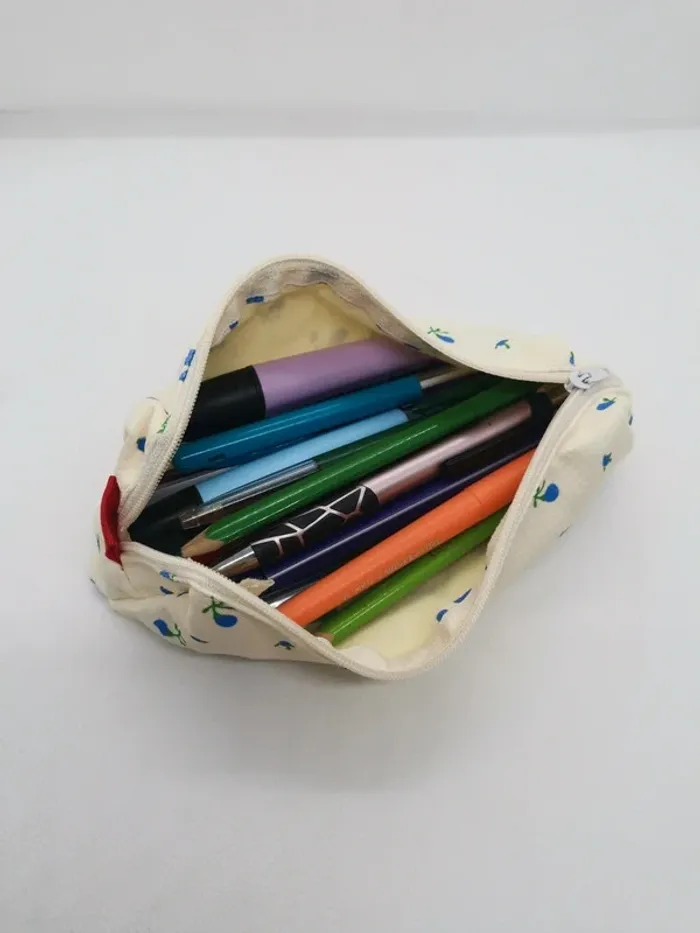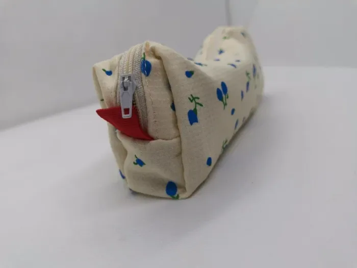 Trousse souple motif floral crème et bleu. Matière polyester. Petite languette rouge pour faciliter l'ouverture par zip. Dimensions : 7cm de hauteur, 5cm de largeur et 17,5cm de longueur. Approximativement car vu sa souplesse elle est extensible. Grande capacité (voir photo 3, fournitures non incluses.). La trousse est idéale pour tous les âges.