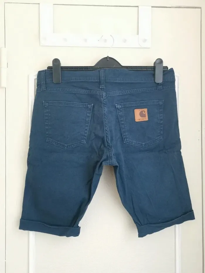 Comme neuf. Couleur bleu-marine. Marque Carhartt Taille sur le short 31x34 semble être du 40/M. Se fier aux mesures : Taille à plat 41,5 cm, Cuisse à plat 22,5cm, Longueur 49cm, Entrejambes 24cm. Vraies poches. 97% coton, 3% élasthanne Economisez les frais acheteurs en suivant #danou_H40 #danou_HM -- #danou00_07