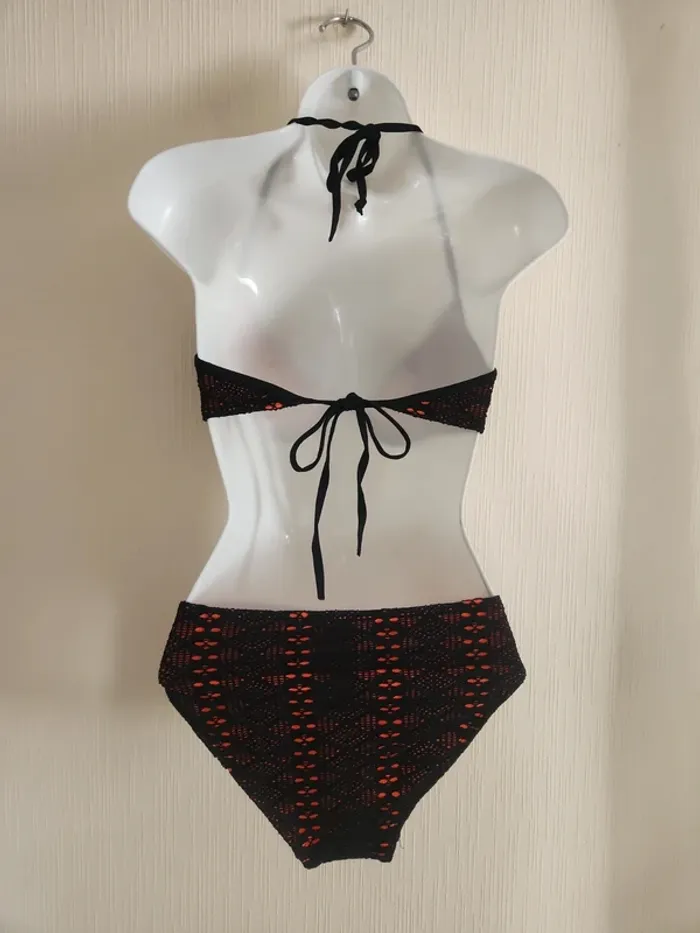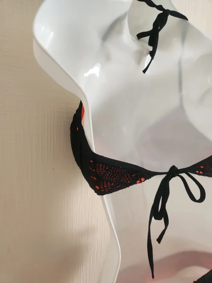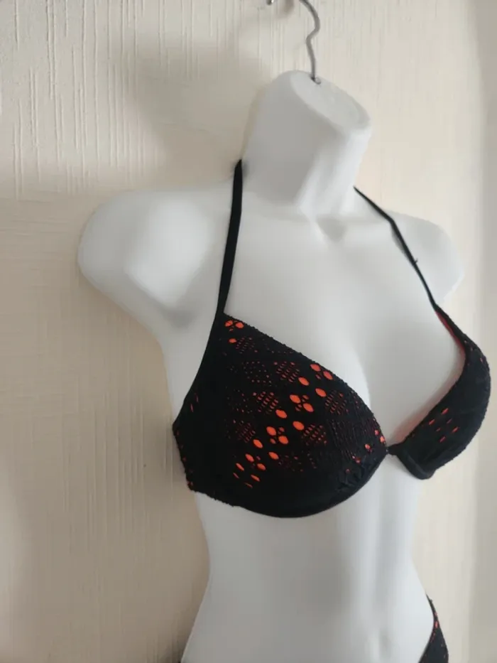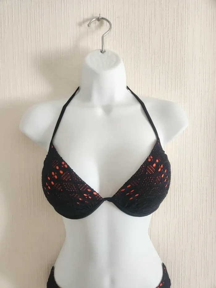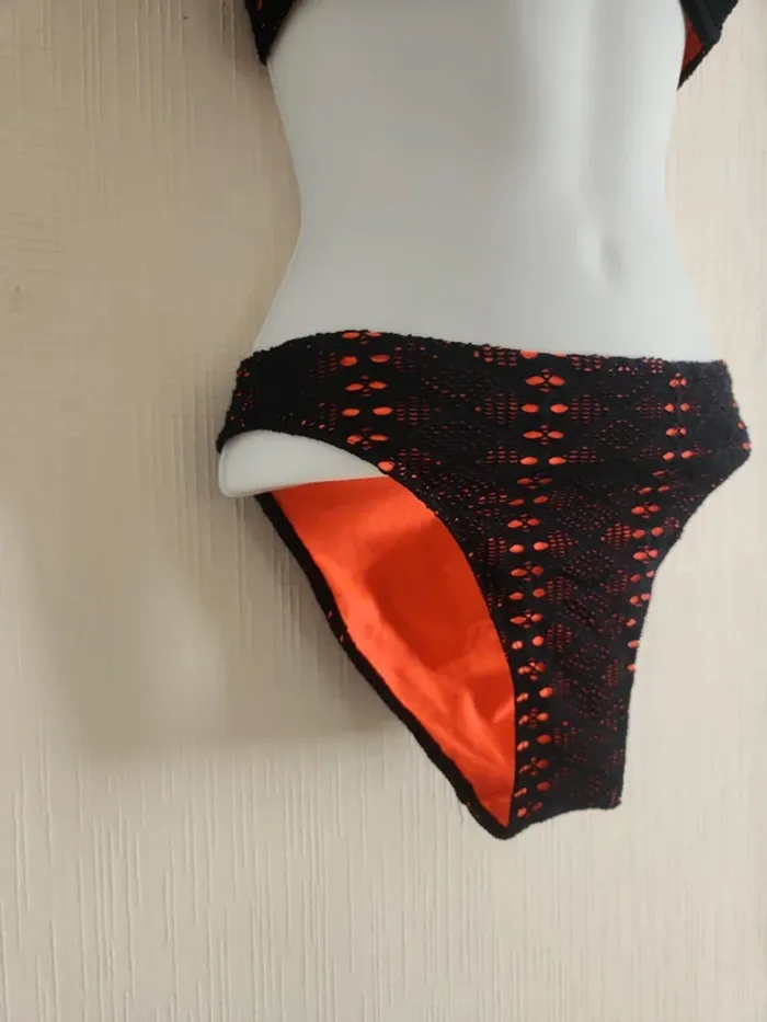 Maillot de bain bikini 2 pièces noir effet crochet ajouré avec doublure orangé corail Bas en taille 36, haut en taille 36/38, étiquette coupée, légèrement rembourré Pas de photos portées ! Envoi rapide et soigné via diverses plateformes #pseudodofemme36 #pseudodofemme38 #bikini #maillotdebain #dentelle #orangé #corail #noir