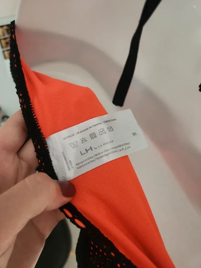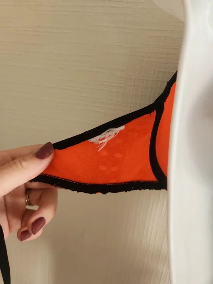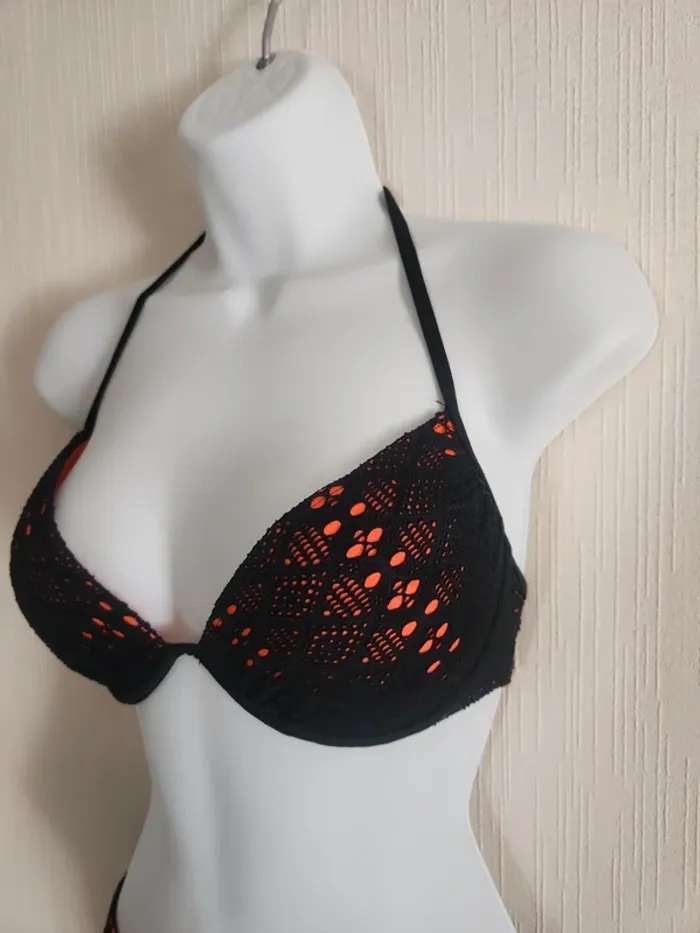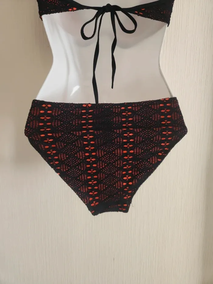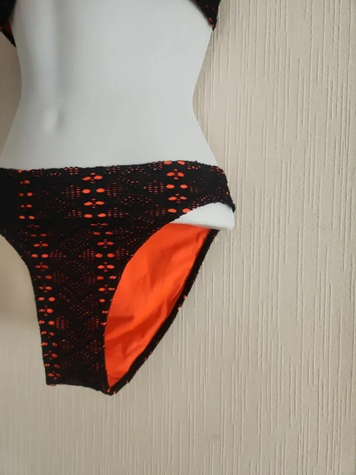 Maillot de bain bikini 2 pièces noir effet crochet ajouré avec doublure orangé corail Bas en taille 36, haut en taille 36/38, étiquette coupée, légèrement rembourré Pas de photos portées ! Envoi rapide et soigné via diverses plateformes #pseudodofemme36 #pseudodofemme38 #bikini #maillotdebain #dentelle #orangé #corail #noir