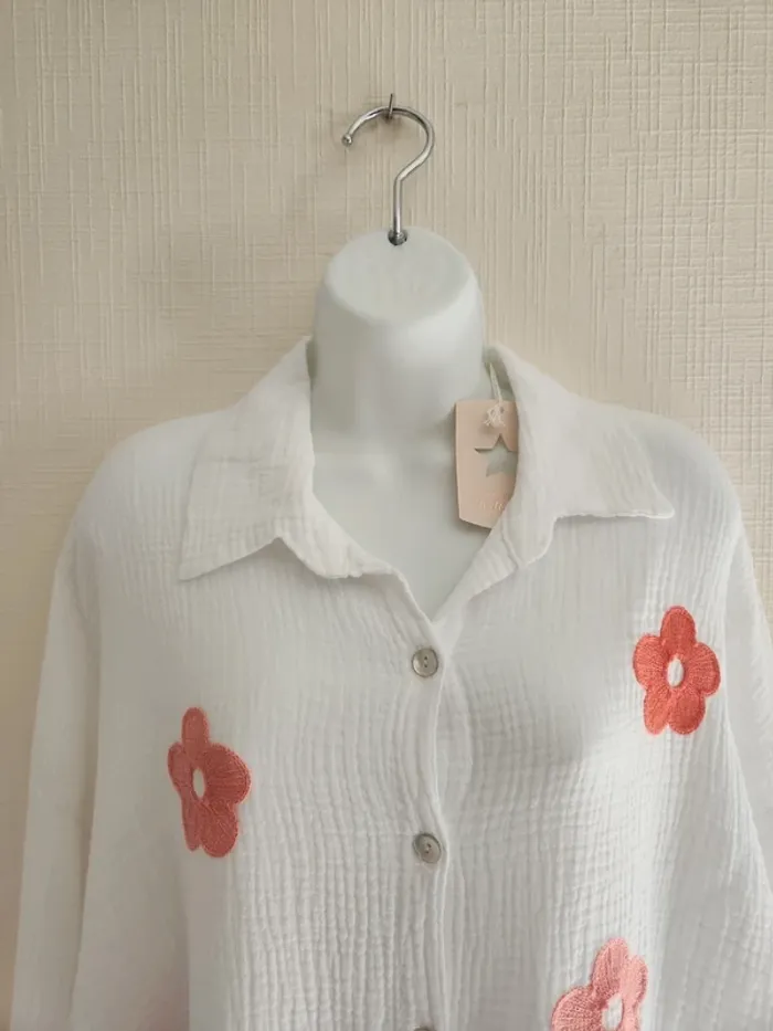 Chemise gaze de coton blanche avec fleurs brodées neuve