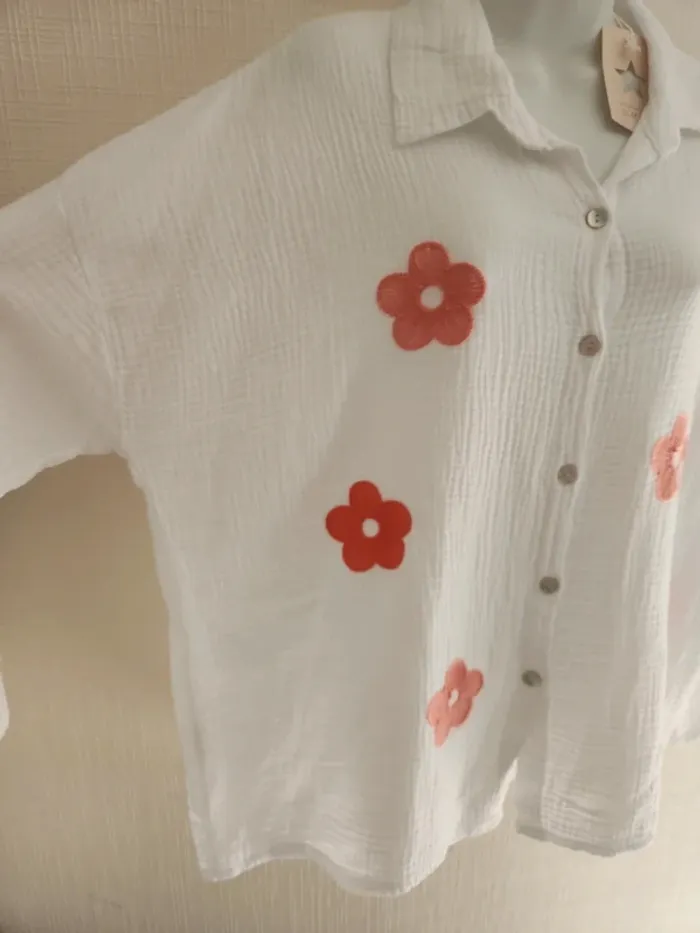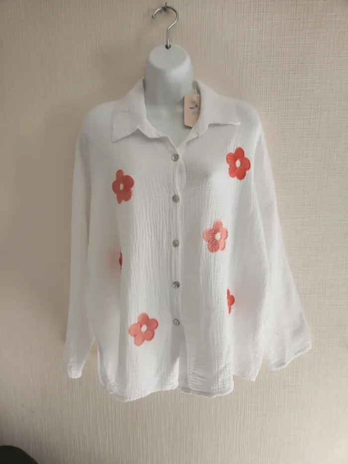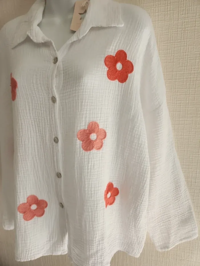 Belle chemise en gaze de coton blanche avec fleurs 🌸 brodées, neuve avec étiquette, made in Italy, taille unique Envoi rapide et soigné via diverses plateformes #gazedecoton #broderies #fleurs #flowers #coton #blanc #White #rose #orange