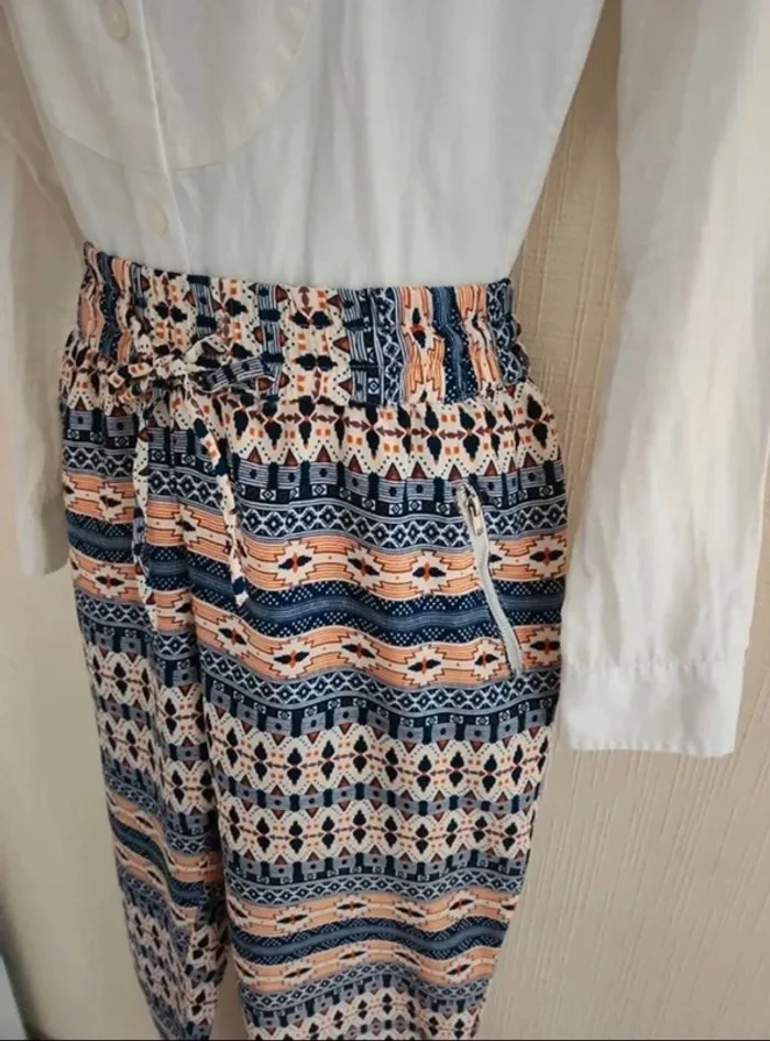 Pantalon tissu fluide de couleur bleu marine, orange et blanc, taille élastique, se ressert par un lien, parfait état Autres articles de cette taille ici: #pseudodofemme38 Envoi rapide et soigné via diverses plateformes #pseudodofemme38 #pantalonfluide #pantalonmotifs #motifs #multicolore