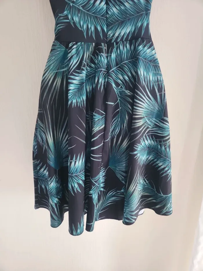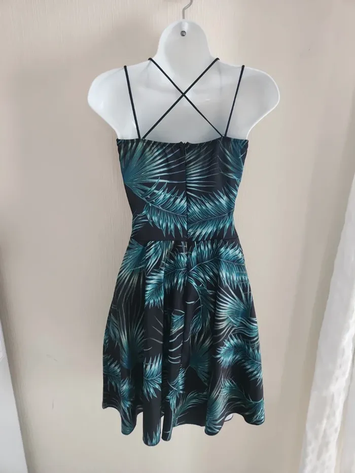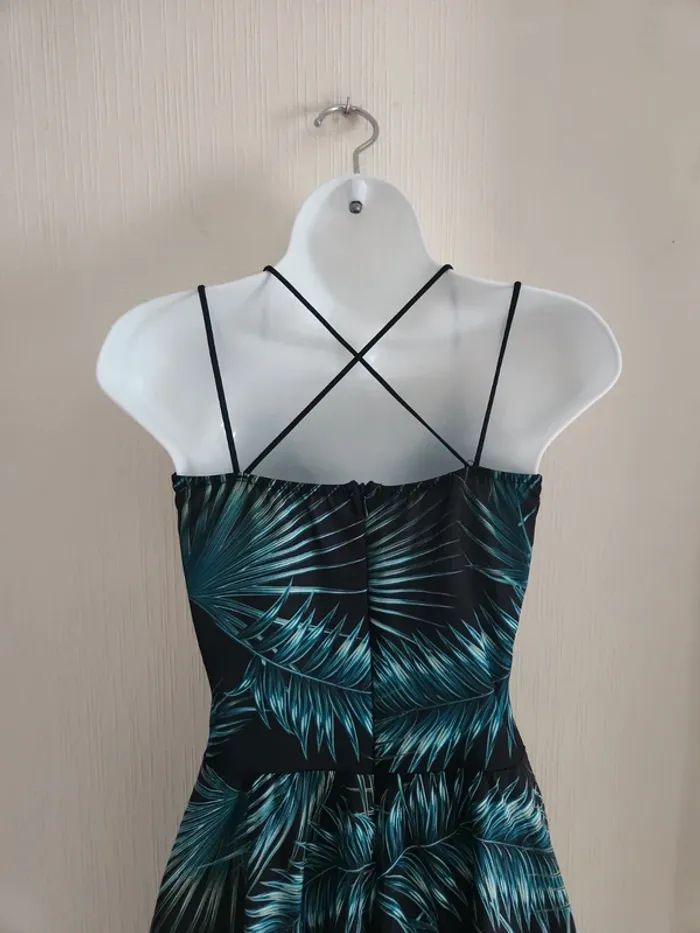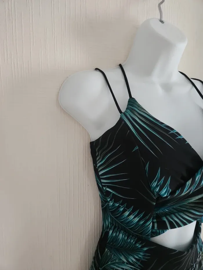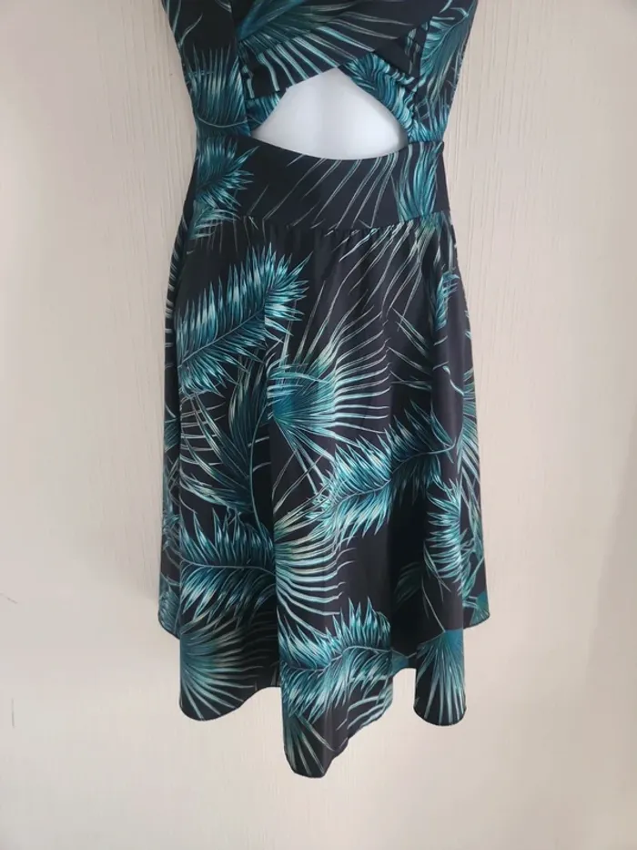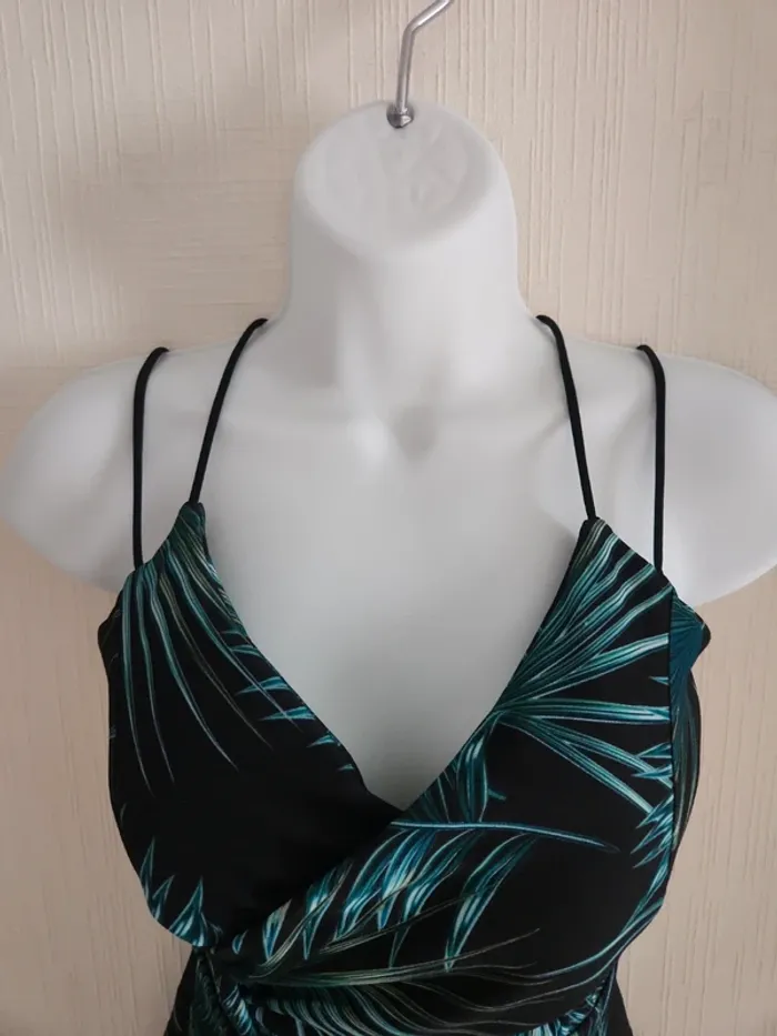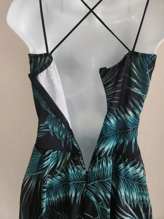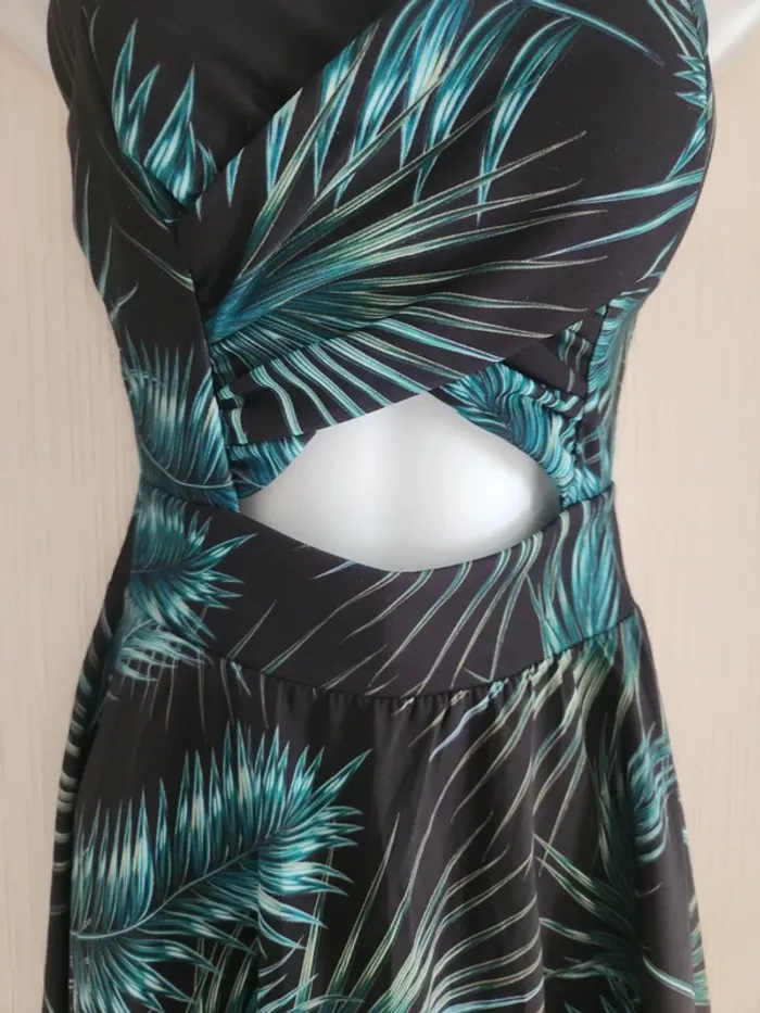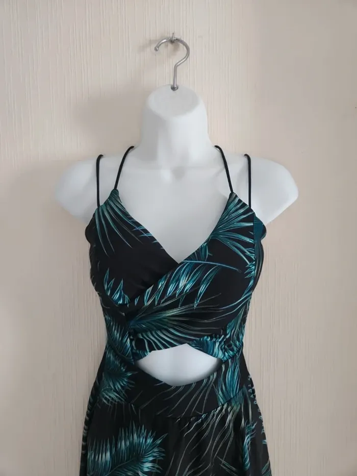 Jolie robe légère à motifs feuillages sur fond noir, ouverture en haut du ventre, tissu croisé à la poitrine et coques dans le haut de la robe, dos dégagé et bretelles croisées