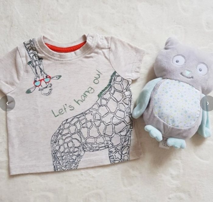 T-shirt manches courtes Primark en 3 mois. Couleur beige avec motif girafe.
