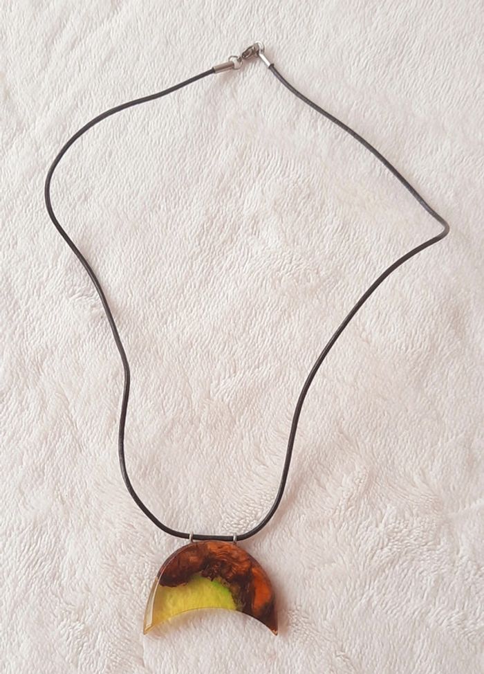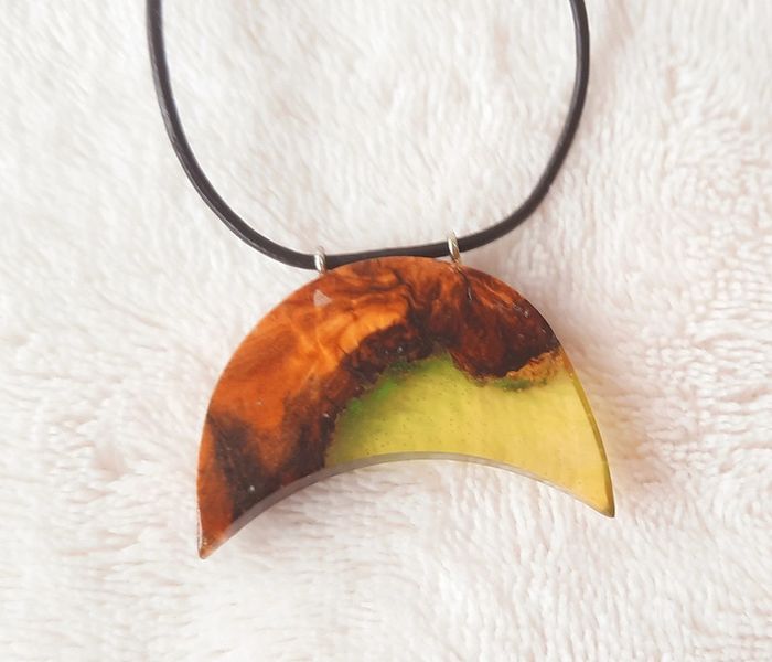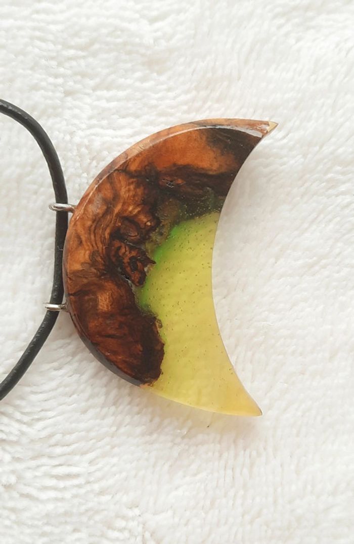 - Collier avec pendentif lune moitié bois d'olivier moitié vert transparent.