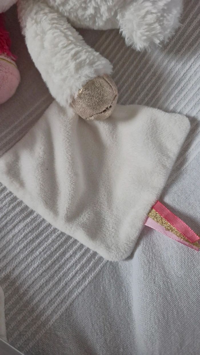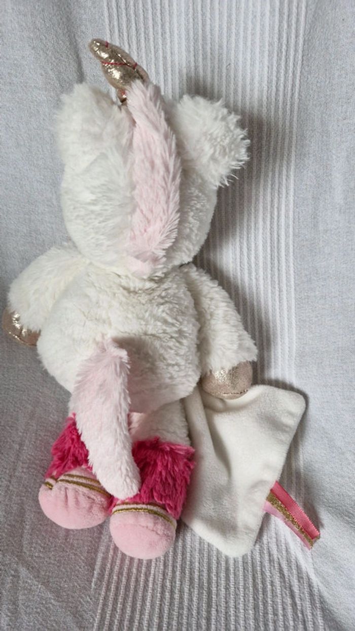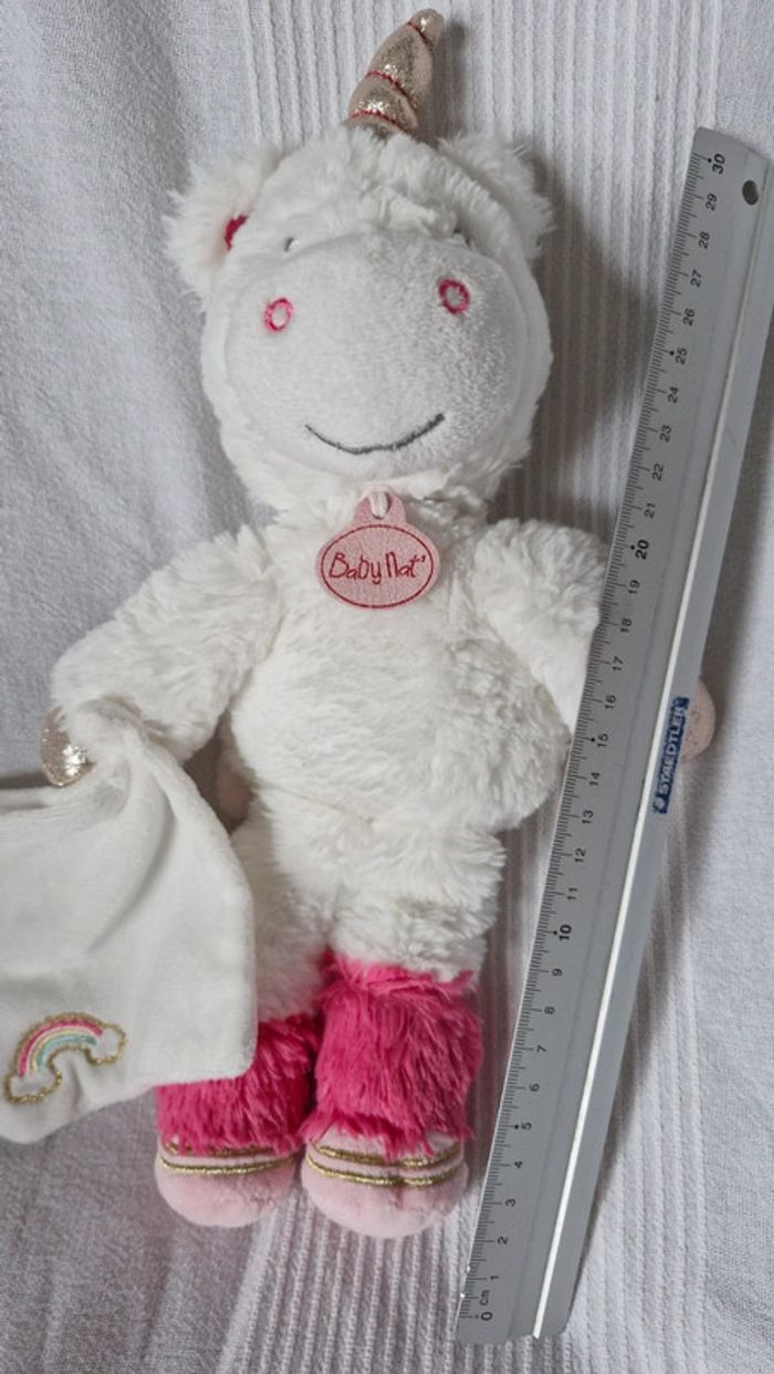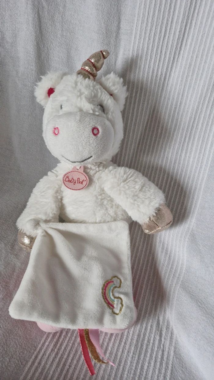 Peluche Babynat Licorne blanche avec arc en ciel sur mouchoir blanc Très bon état mais plus de étiquette de marque Pour voir tous les doudous #OceanisseDoudou #OceanisseBabynat