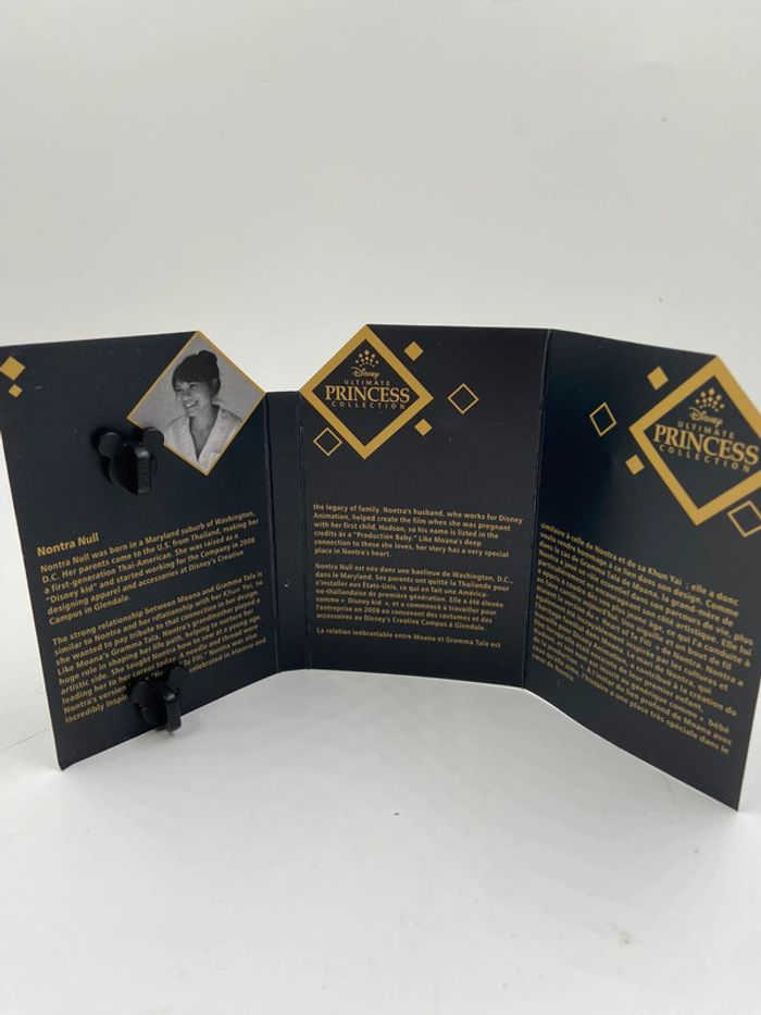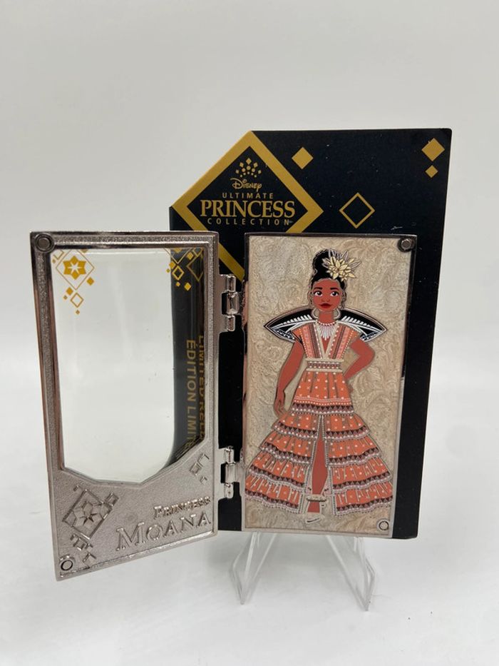 Conçue par l'artiste Disney, Nontra Null, cette superbe broche Moana en édition limitée présente la princesse Disney rendue dans une palette colorée, ainsi qu'un design de porte à charnière transparent sur le devant.