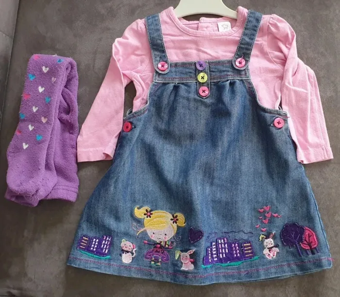 Ensemble 4 pièces C&A 74cm Robe jean, tee-shirt manches longues, collant chaud et pull #12moischouchoudu17