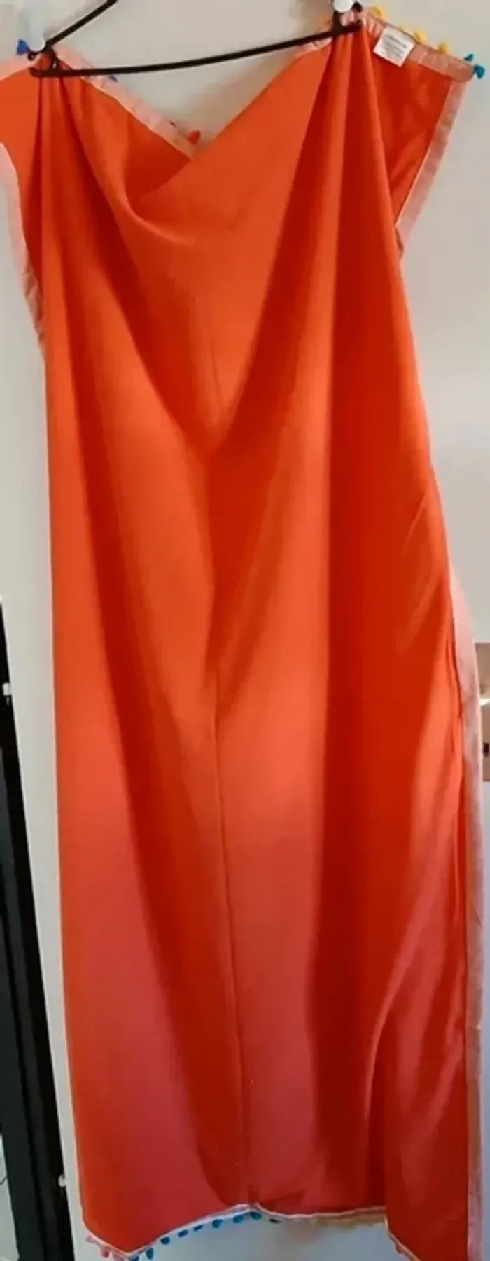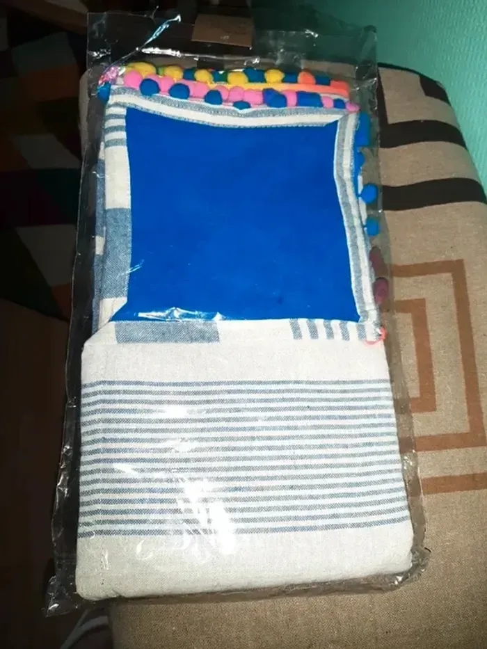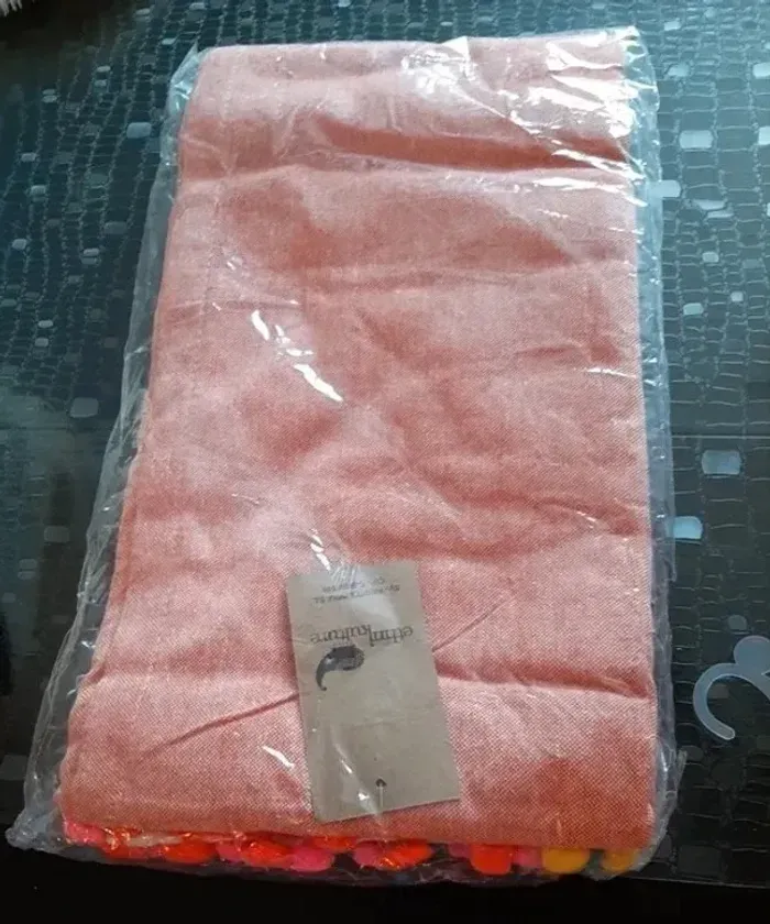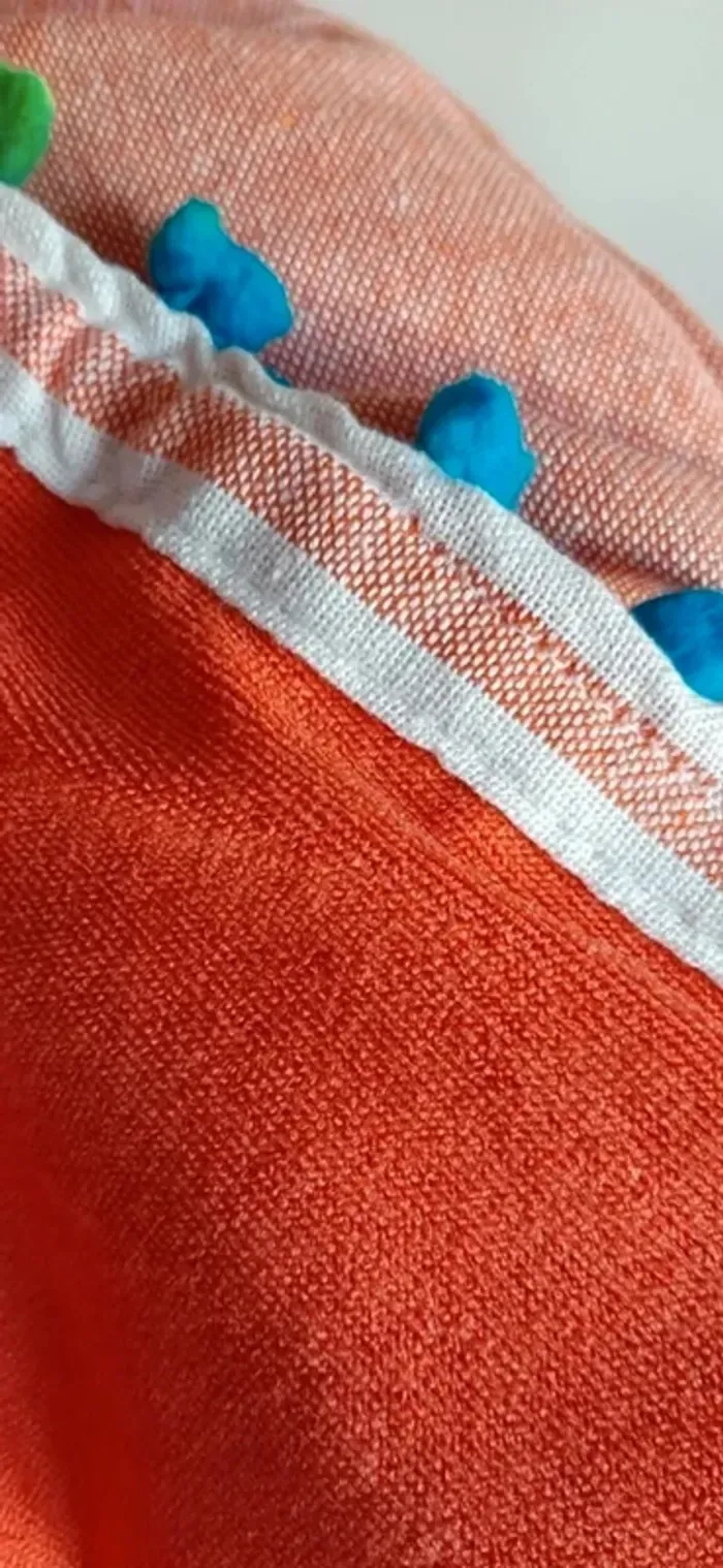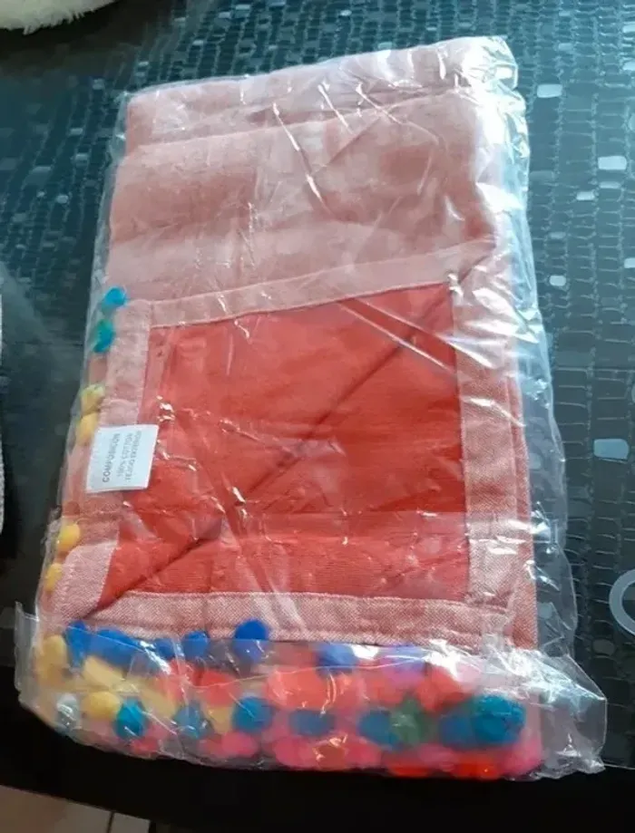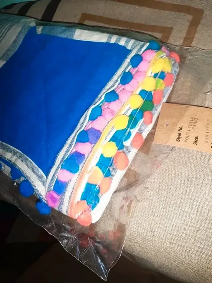 Fouta paréo serviette de plage Très colorée Coton Fait en Inde Finition pompoms multicolore Une corail et une bleu vif 90x170 15 euros l'une 26 euros les deux