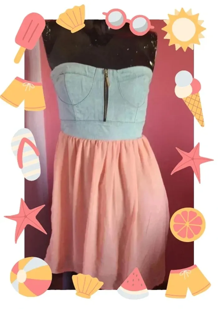 En bon état .Robe bustier en jeans et voile mousseline rose saumon double.Le bustier est smoké au dos pour mieux s'adapté à la silhouette .Fausse fermeture éclair .Fabrique en Italie . Plus de vêtements de cette taille cliquez sur le lien et n'oubliez pas de désactiver les filtres.Jusqu'a 30% de réduction en cas d'achats multiples 😉 #Gnyfer08vêtementsfemme34