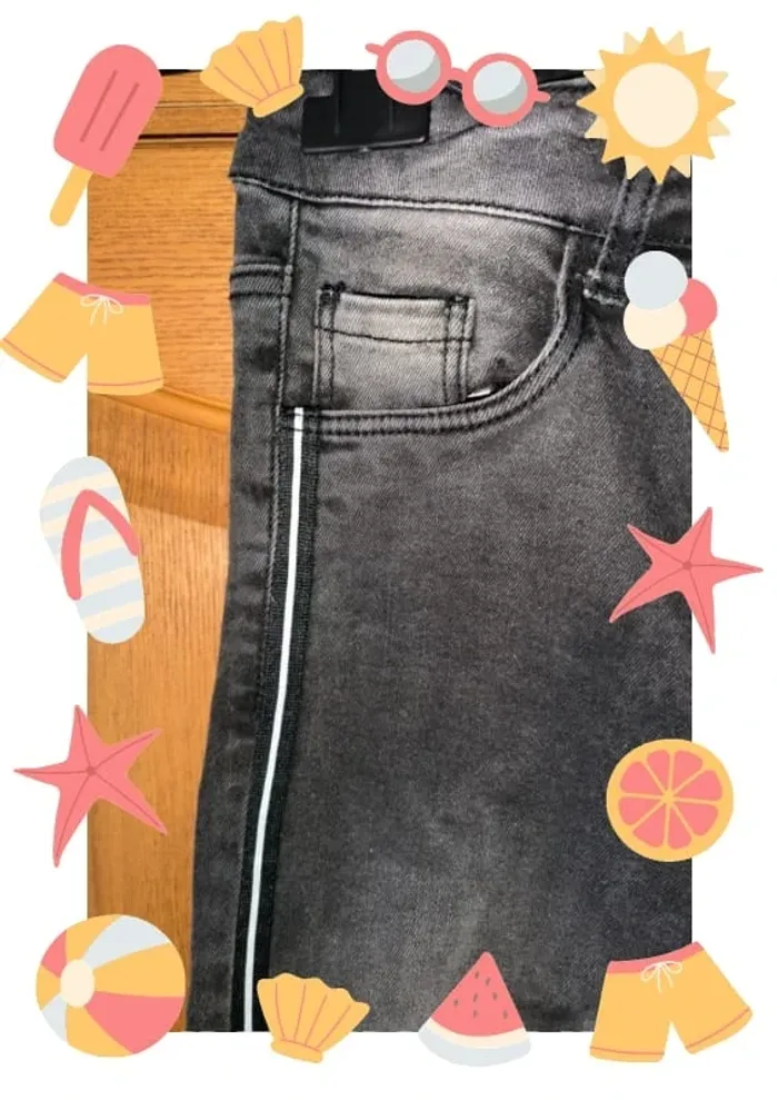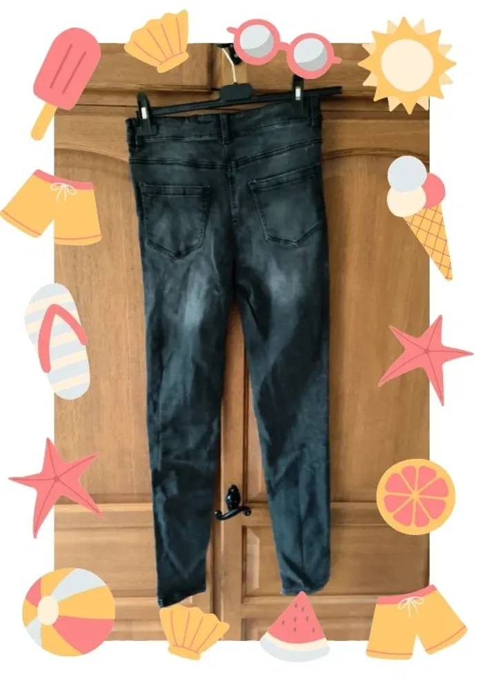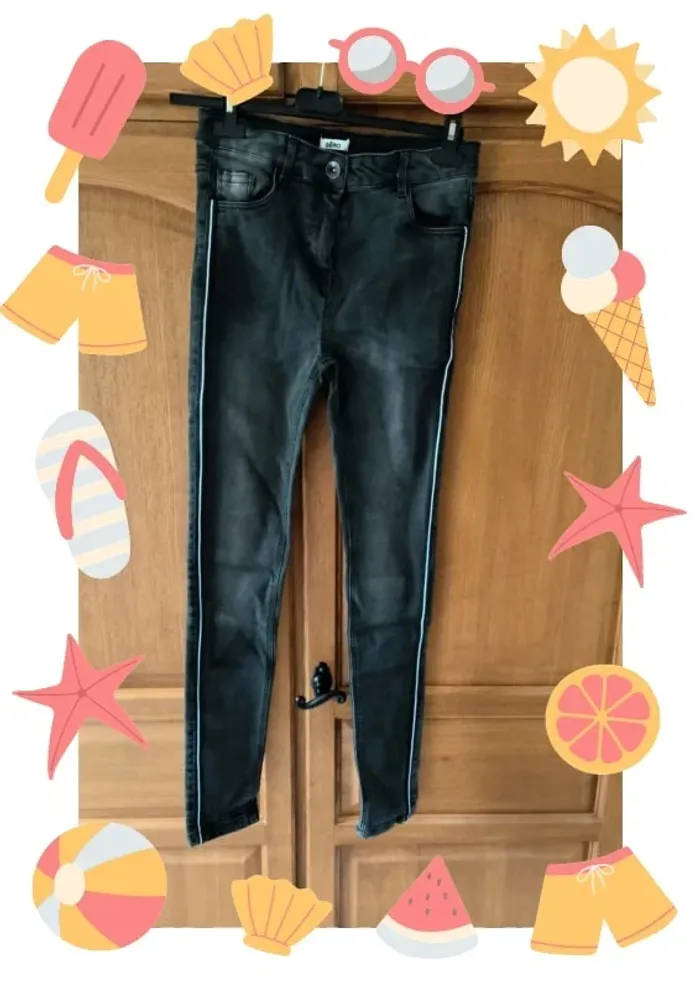 En excellent état . Pantalon jeans skinny gris/noir avec bande liseret blanc de chaque coté le long des jambes . Il possède un élastique de resserrage à la taille . 99% coton 1% elasthanne Taille 16 ans . #Gnyfer08vêtementsfille16ans