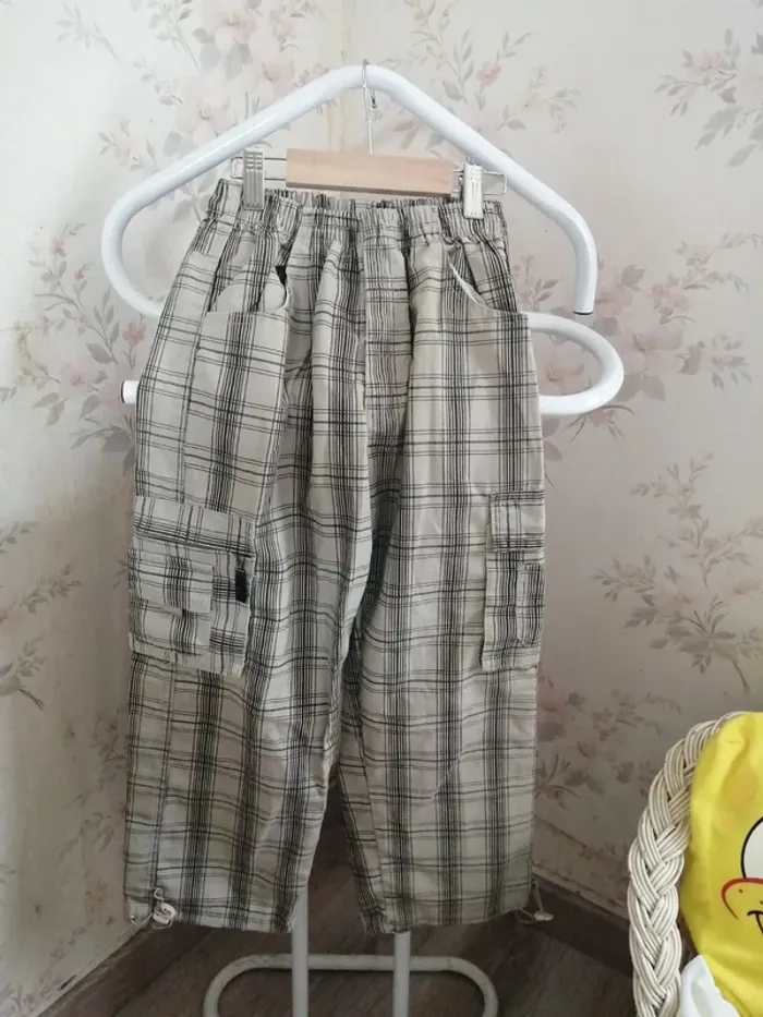 Pantalon cargo beige et noir à carreaux avec poches et lien à nouer / sans marque / (6ans) - photo numéro 1