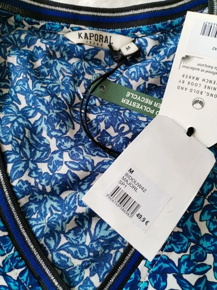 #babydressing77_femme Blouse Kaporal modèle BIDOUW42 MAJORL SP1, neuve avec étiquette, jamais portée 💶 Valeur boutique : 49,90 € 🔹 Taille : M 🔹 Manches : 3/4 🔹 Col : V avec liseré contrasté 🔹 Motif : floral bleu sur fond blanc 🔹 Tissu fluide et agréable à porter, coupe confortable. 📸 Plusieurs photos disponibles pour voir les motifs de près 📦 Envoi rapide et soigné 💬 Prix négociable dans la limite du raisonnable